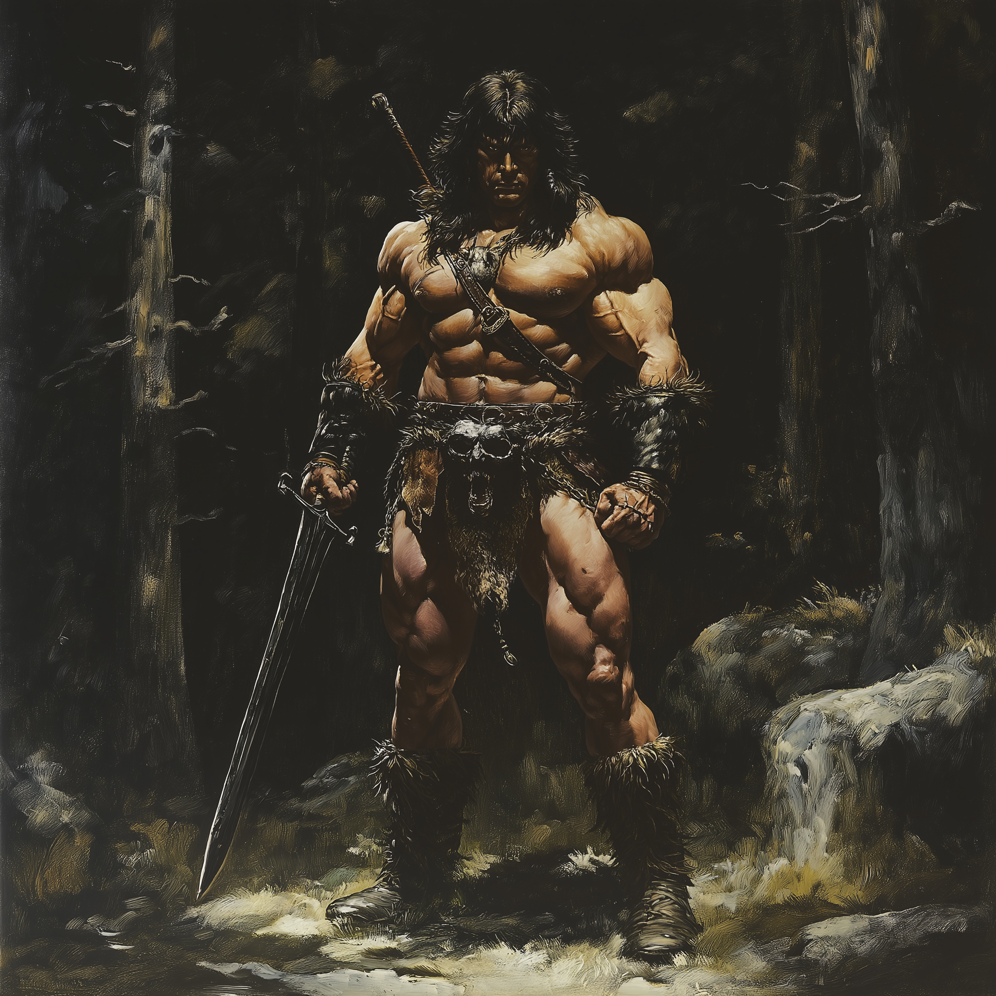 The image depicts a powerful barbarian standing in a lush green forest, exuding an air of strength and readiness. With a realistic style reminiscent of classic fantasy illustrations, the scene captures the tension of an impending attack.