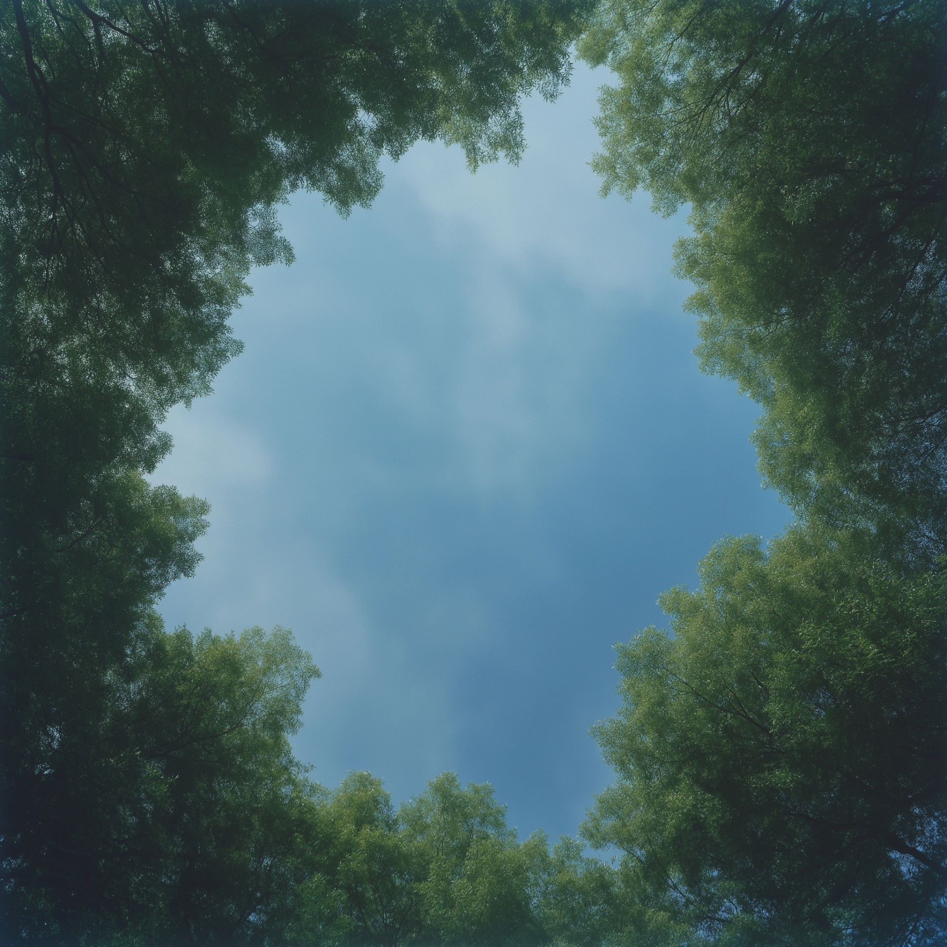 The image captures a lush forest filled with vibrant dark green foliage under a bright blue sky. It evokes a refreshing summer atmosphere, inviting viewers to immerse themselves in the tranquility of nature.