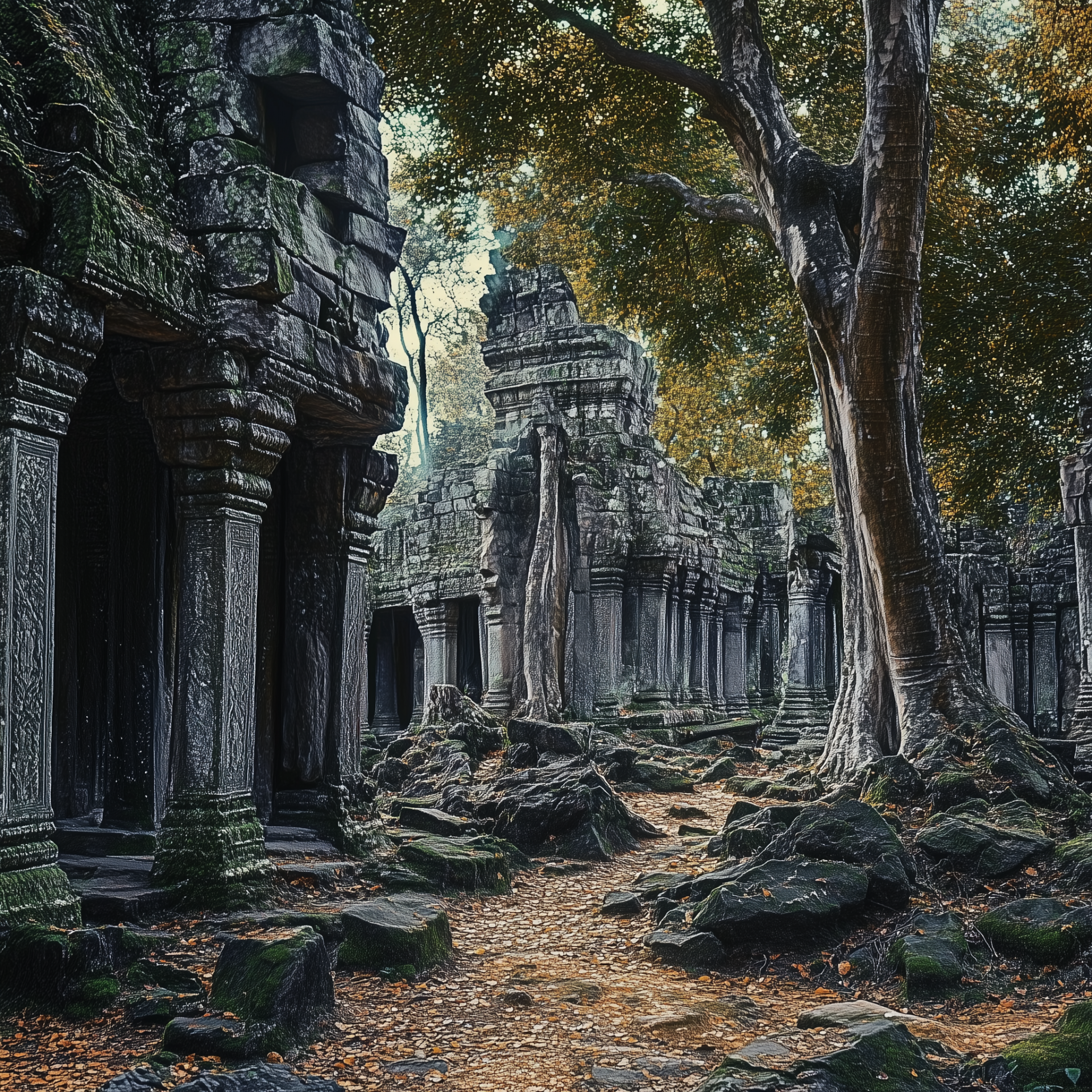 The image portrays ancient ruins hidden within a lush beech forest, cloaked in mystery. Sunlight filters through the trees, casting dappled shadows on the stone structures, creating an enchanting and tranquil atmosphere.