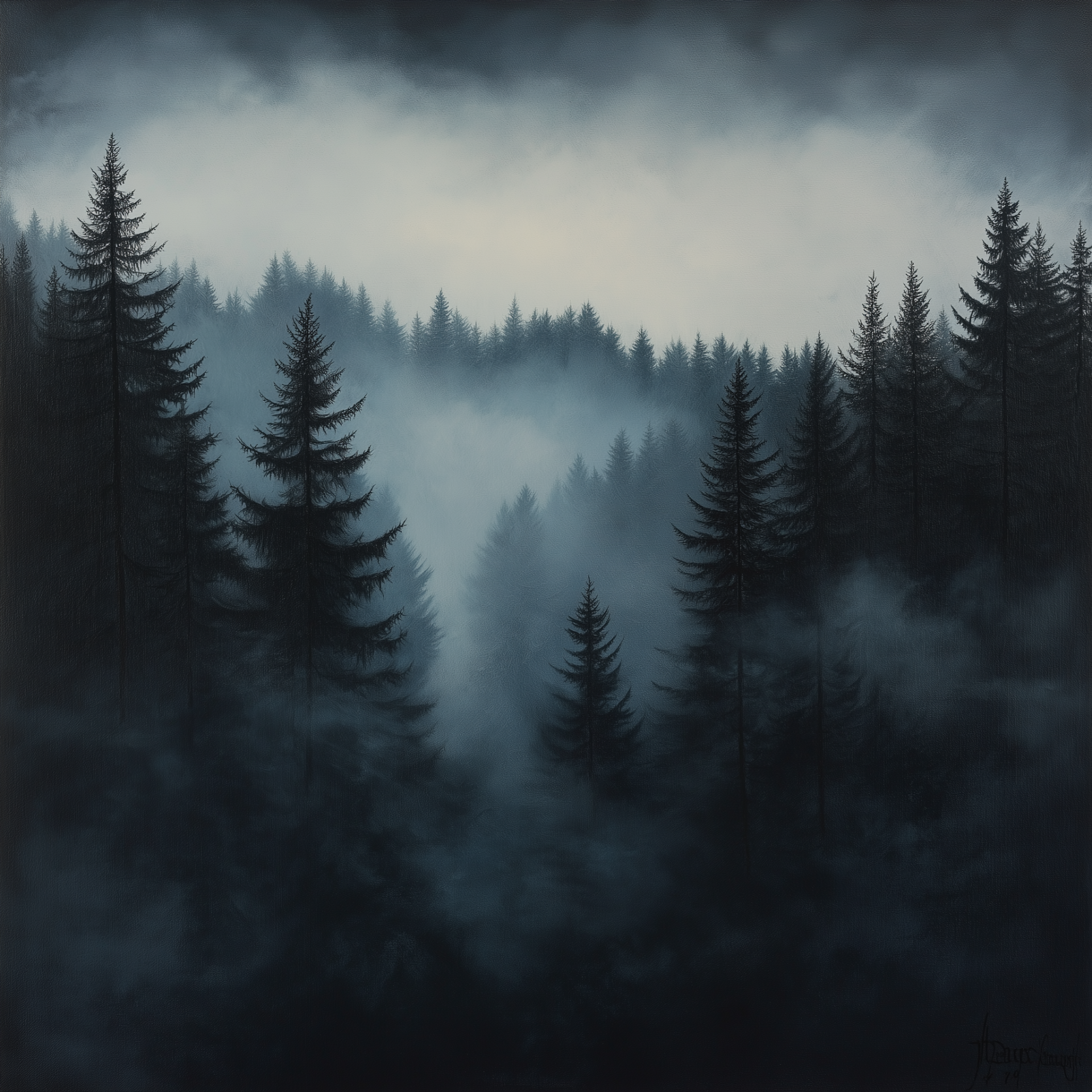 The image captures the enchanting atmosphere of the Black Forest shrouded in a layer of rising fog at dawn. Faint sunlight breaks through the mist, casting a soft glow on the dark, towering trees that create a mysterious ambiance.