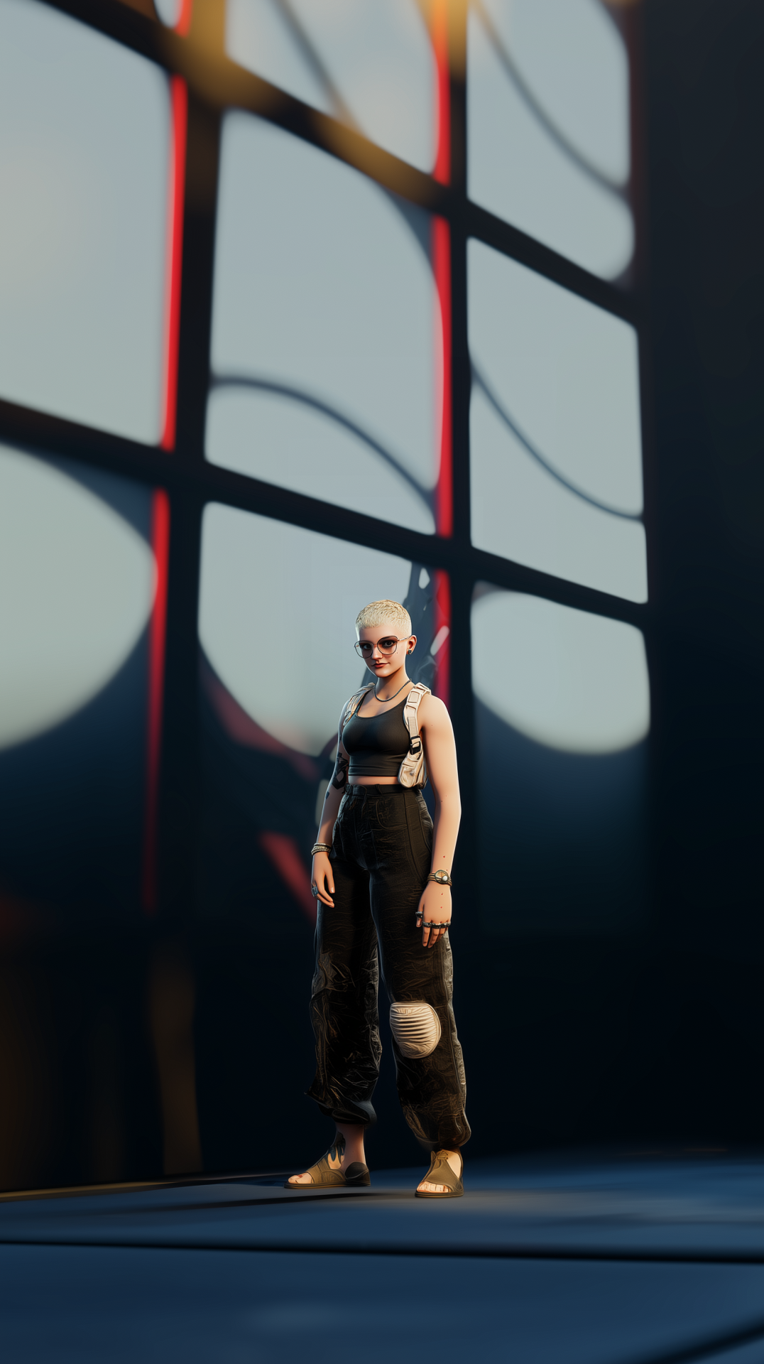 This image features a highly detailed, futuristic costume with vibrant red accents and various artifacts. The character exudes a positive energy, set against a visually striking backdrop that enhances the overall cool aesthetic.