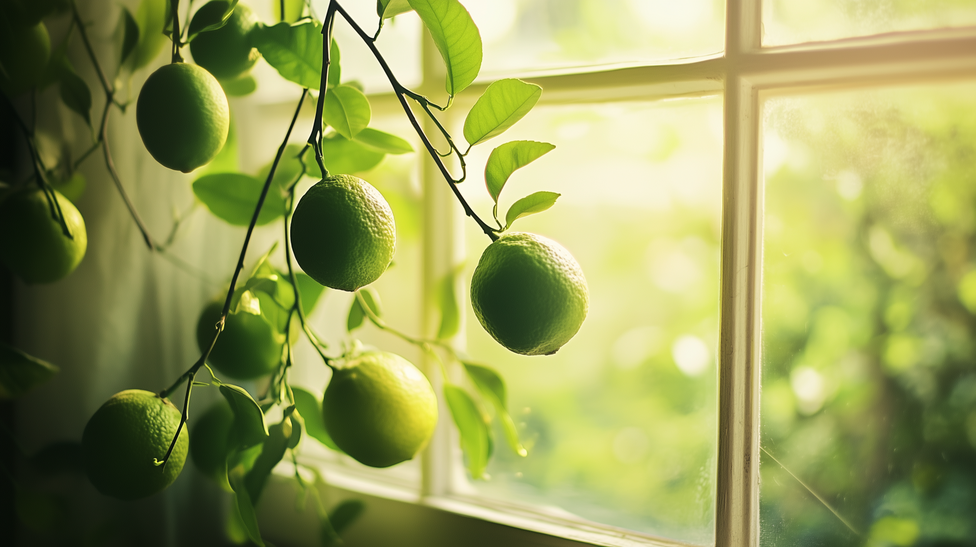 Limes are hanging gracefully from branches, creating a fresh and airy ambiance. The soft natural light highlights the minimal composition against a warm-toned background.