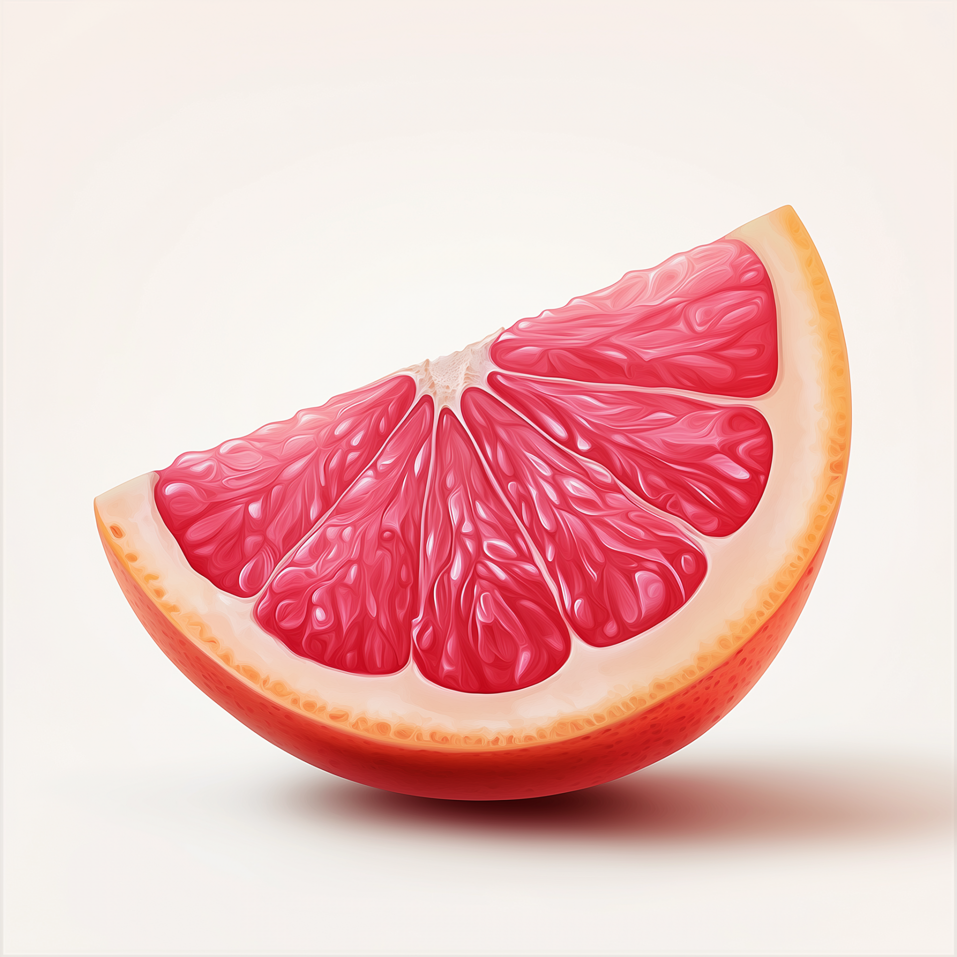 This illustration showcases a beautifully detailed half of a ruby red grapefruit against a stark white background. The artwork is rendered in a sharp focus, emphasizing the vibrant colors and textures of the fruit, providing a hyper-realistic feel.