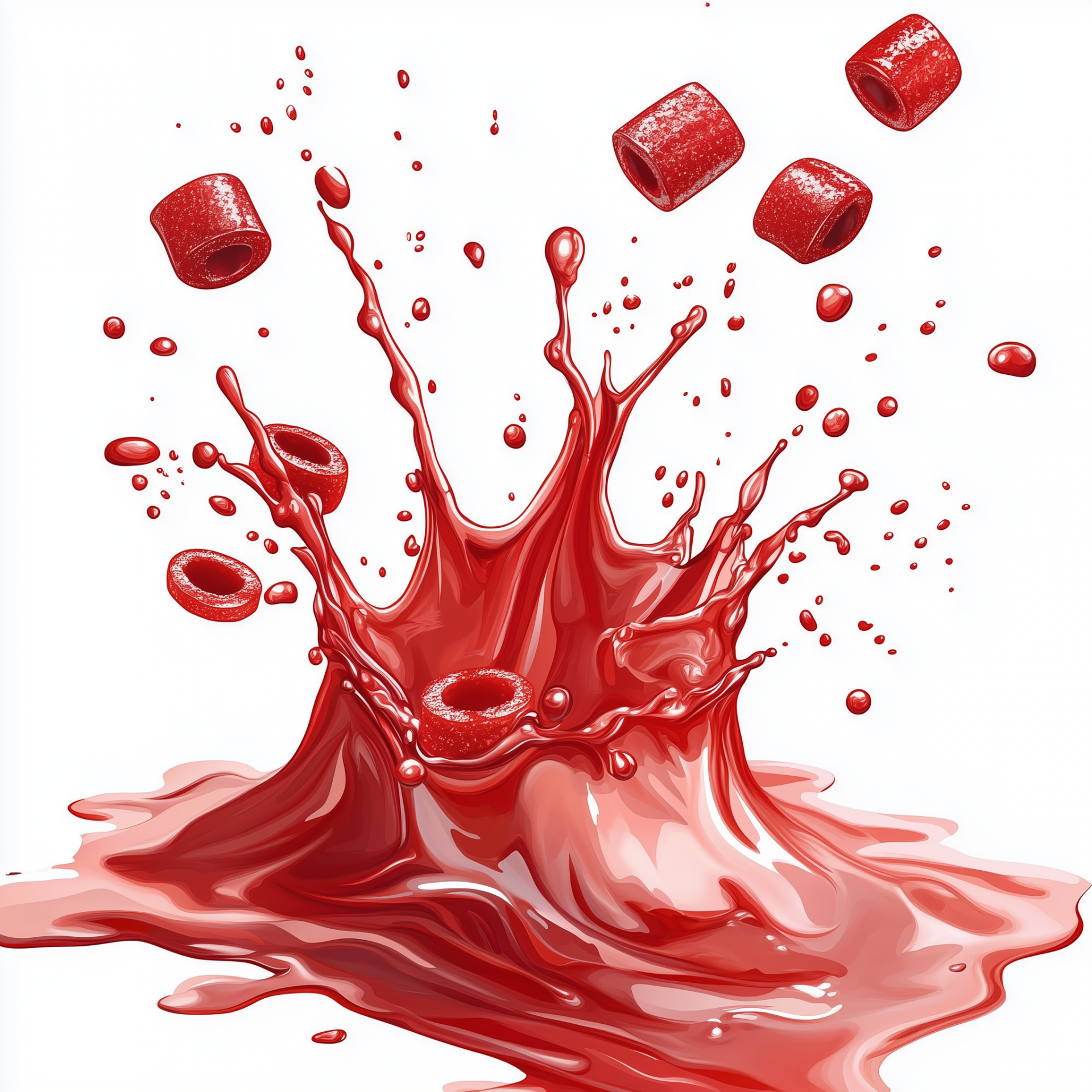This illustration features a dynamic splash of light red liquid, exuding a sense of motion and energy. The vibrant colors create a playful and refreshing atmosphere, reminiscent of fruity drinks or summer delights.