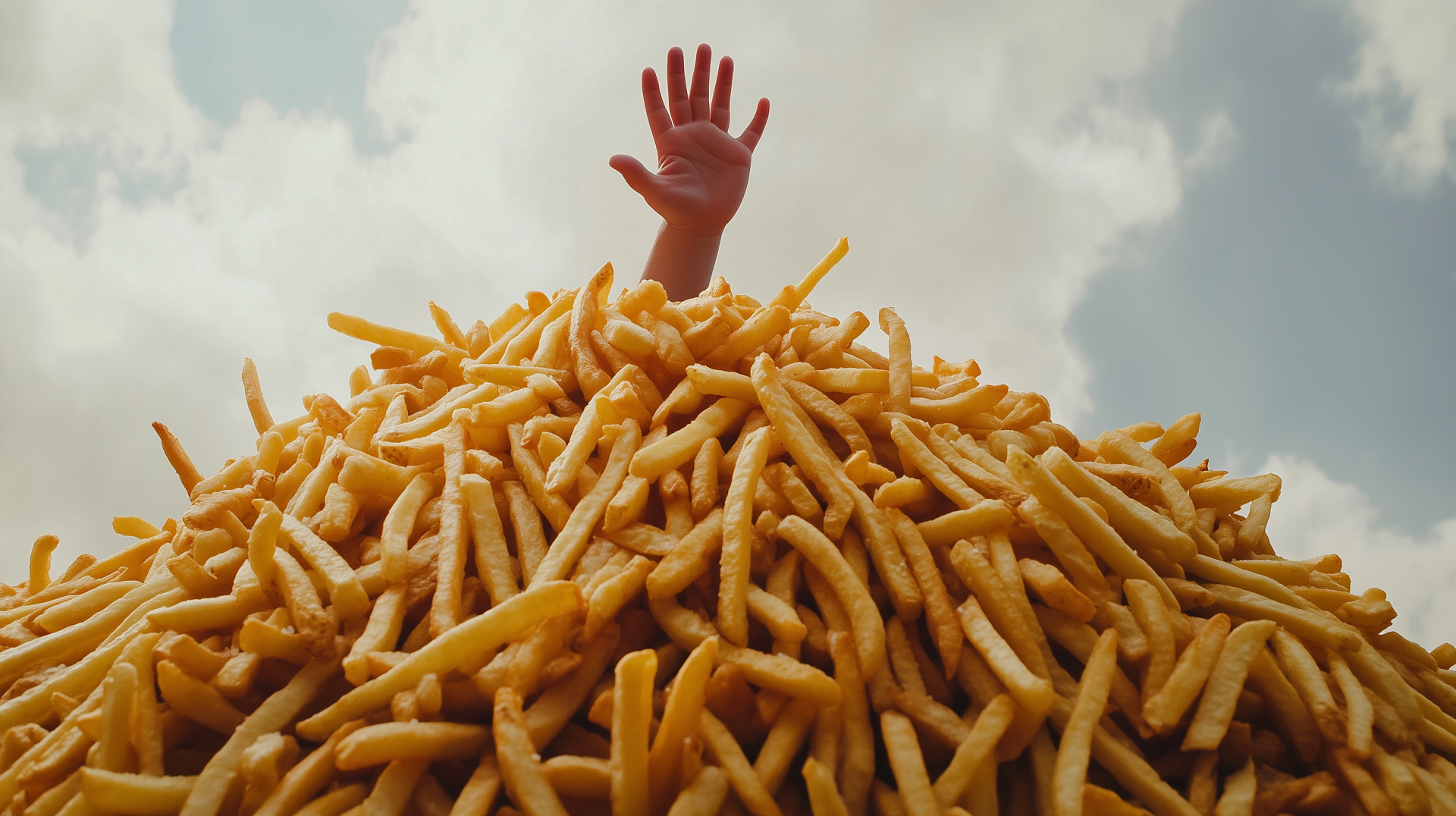 The image depicts a surreal scene where a person is partially submerged under a giant mound of golden brown french fries. Their arm is raised above the fries, as if they are reaching out for assistance, creating a humorous yet whimsical visual.