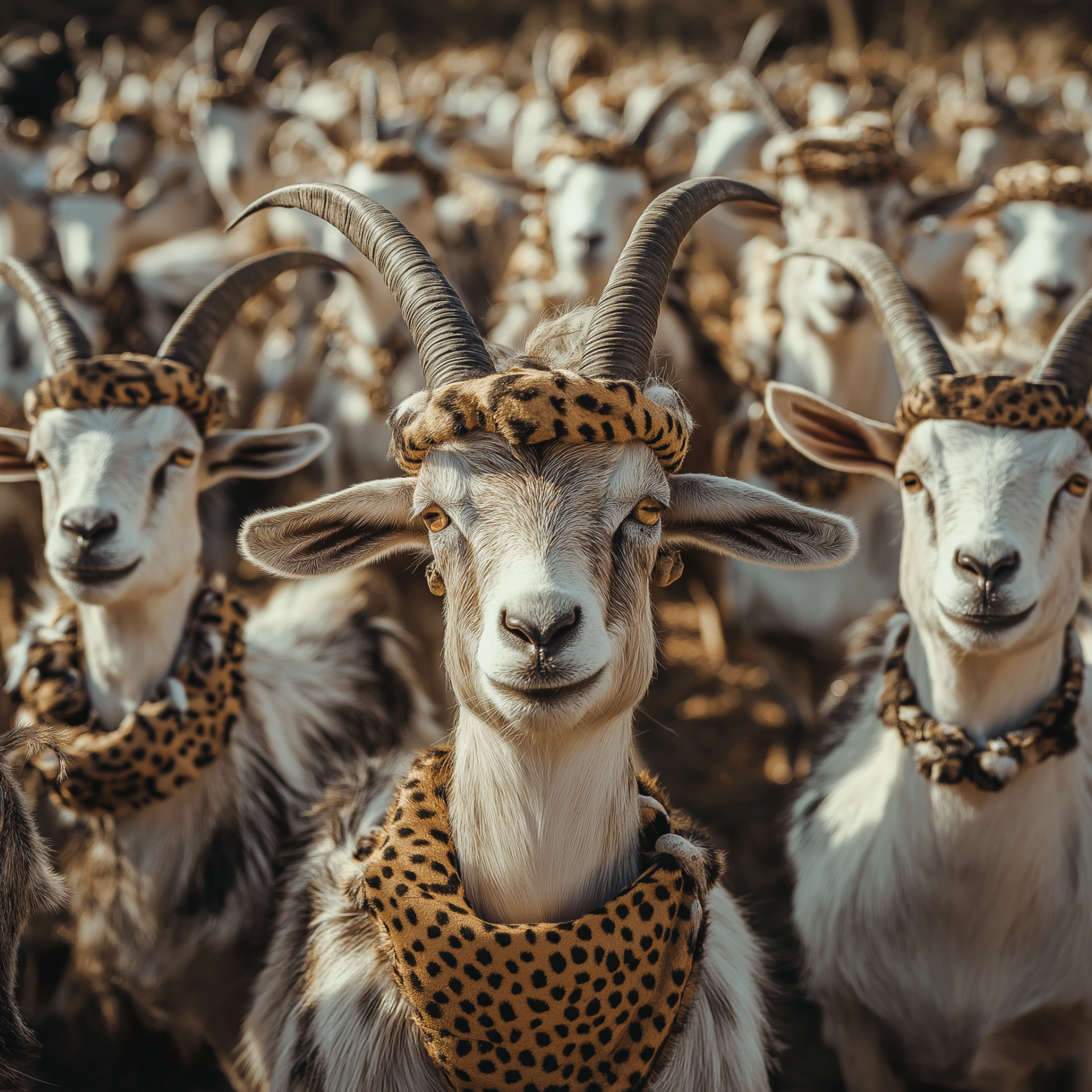 This image captures a playful herd of goats clad in vibrant African Zulu attire, showcasing their lively and human-like energy. The goats are accessorized with hats and other fun elements, set against a backdrop that enhances the cinematic quality of the scene.