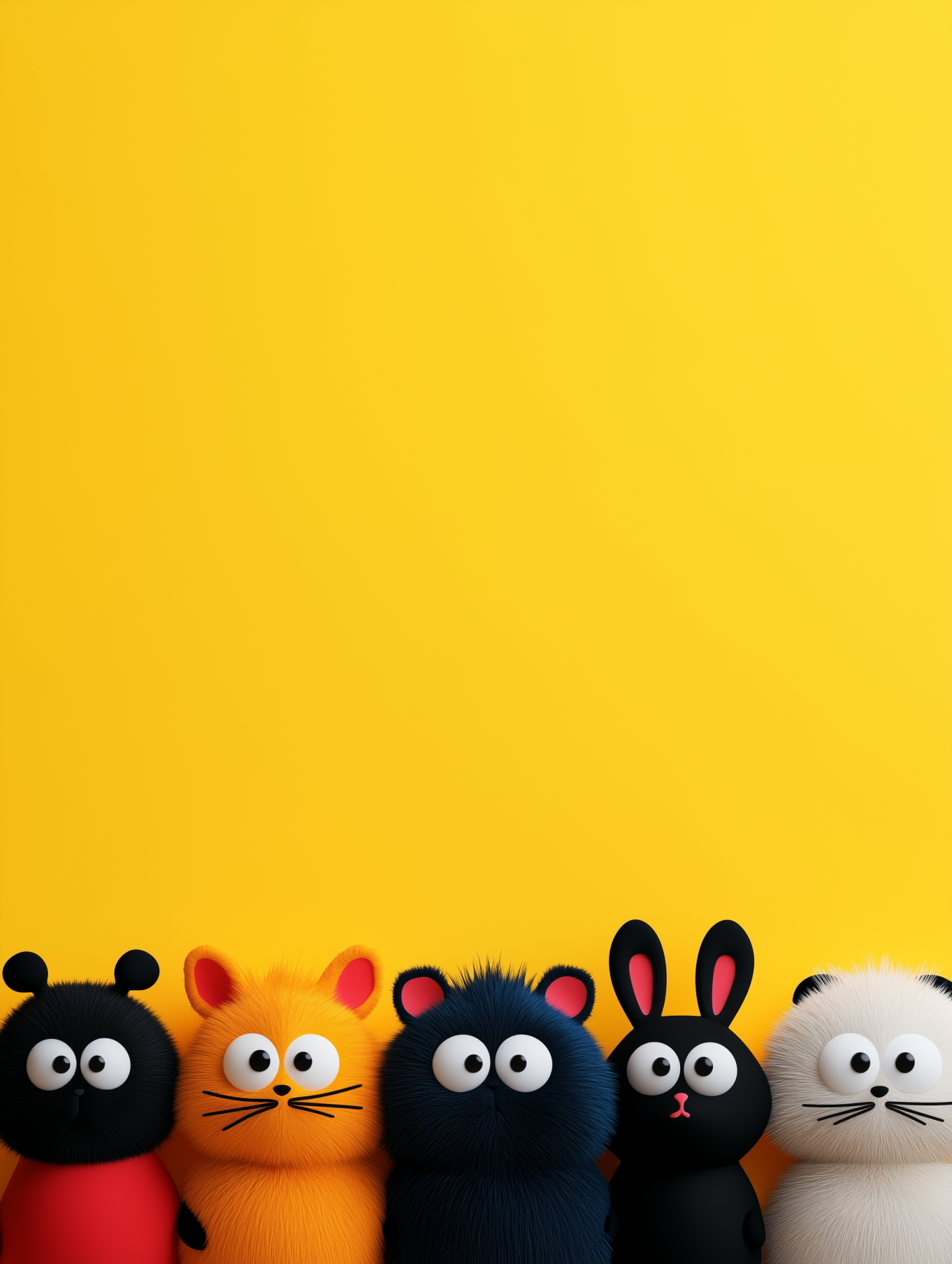 This illustration features a horizontal panel depicting various animals in a playful, cartoonish 3D style. The vibrant yellow background enhances the cute and whimsical nature of the big-headed characters.