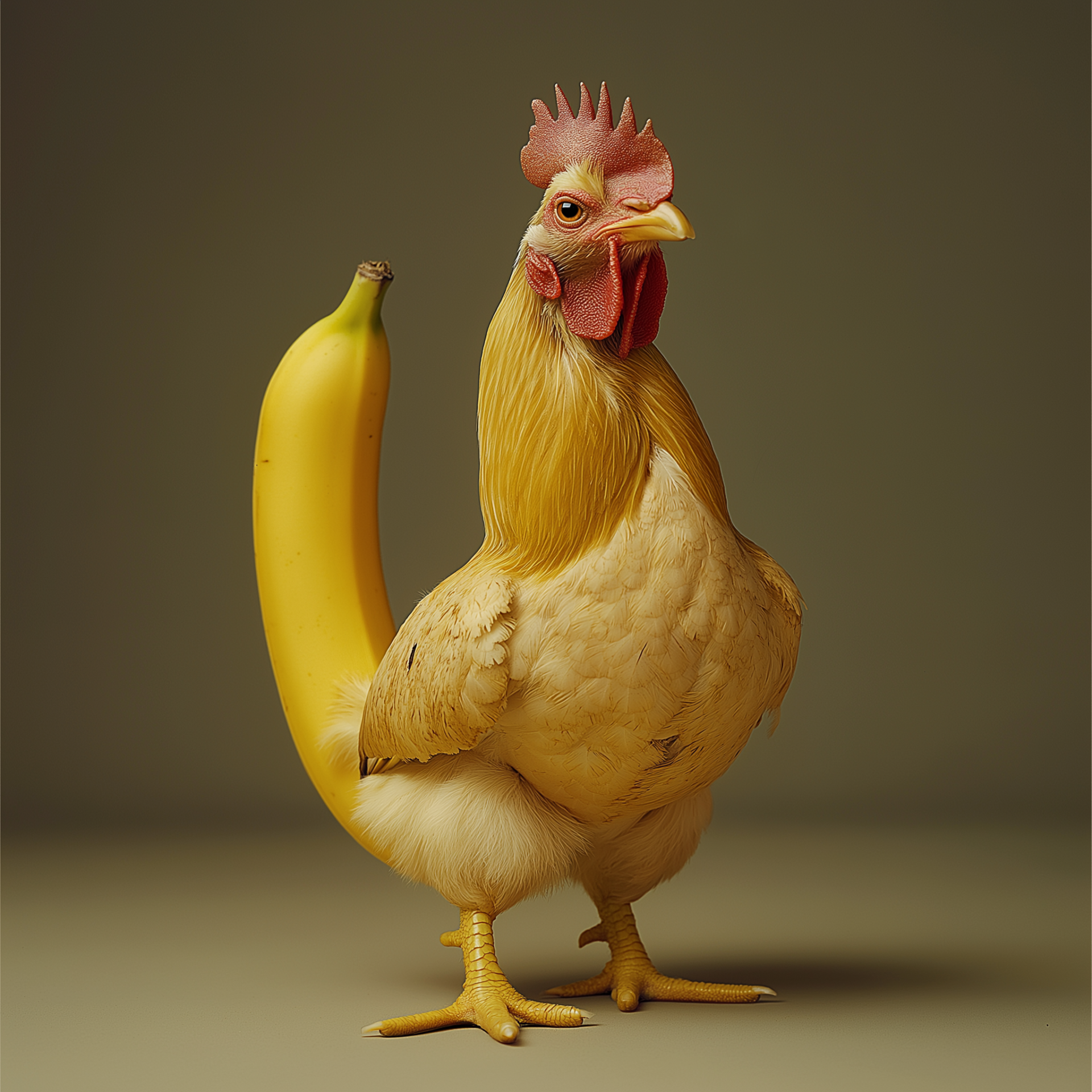 This quirky image features a humorous fusion of a chicken and a banana, presented as a single entity. The chicken head rests atop the banana, creating an amusing and delightful visual experience.