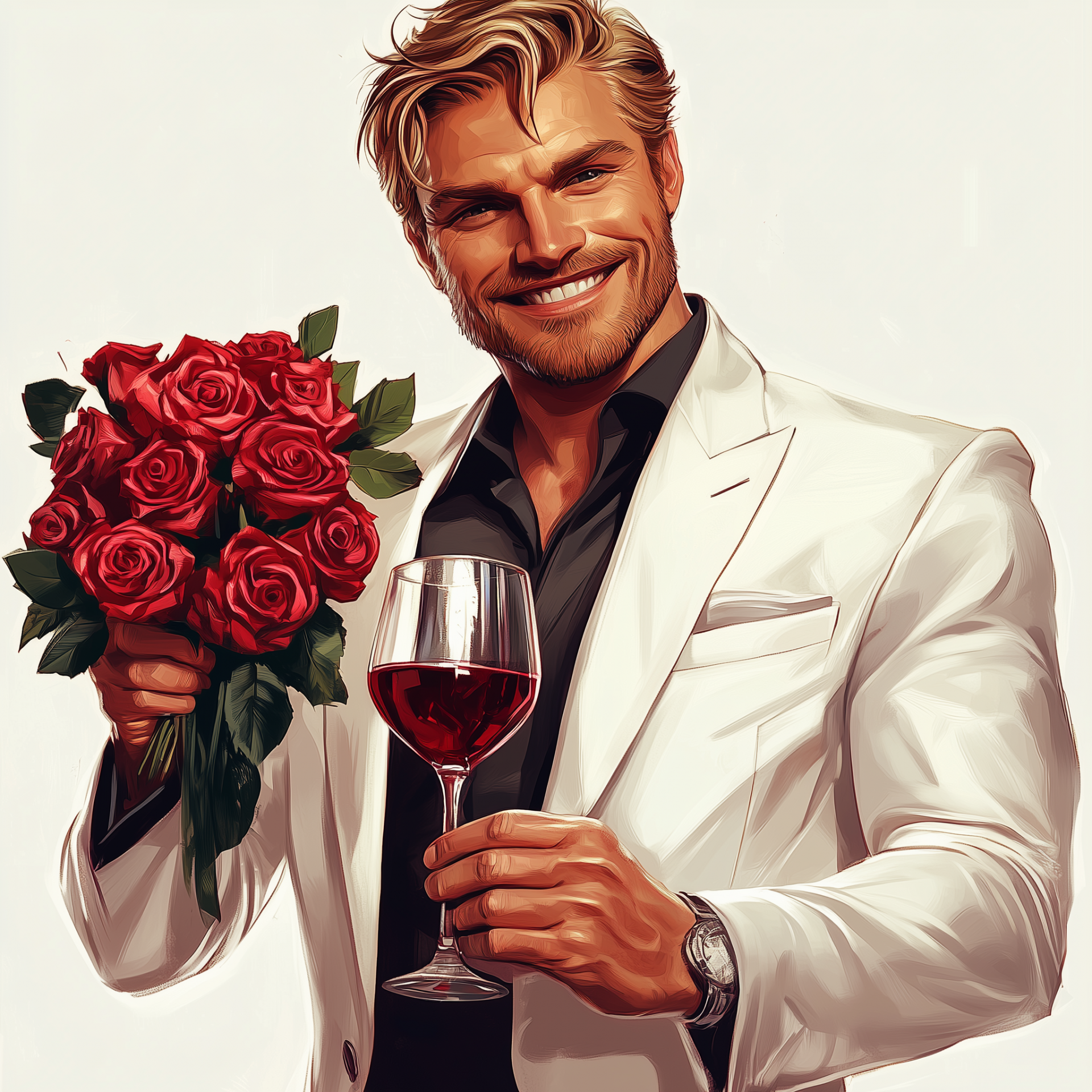 This illustration features a charming blond man in a stylish white suit, holding a glass of red wine while playfully raising it. His engaging smile and the vibrant red roses create a whimsical and humorous atmosphere.