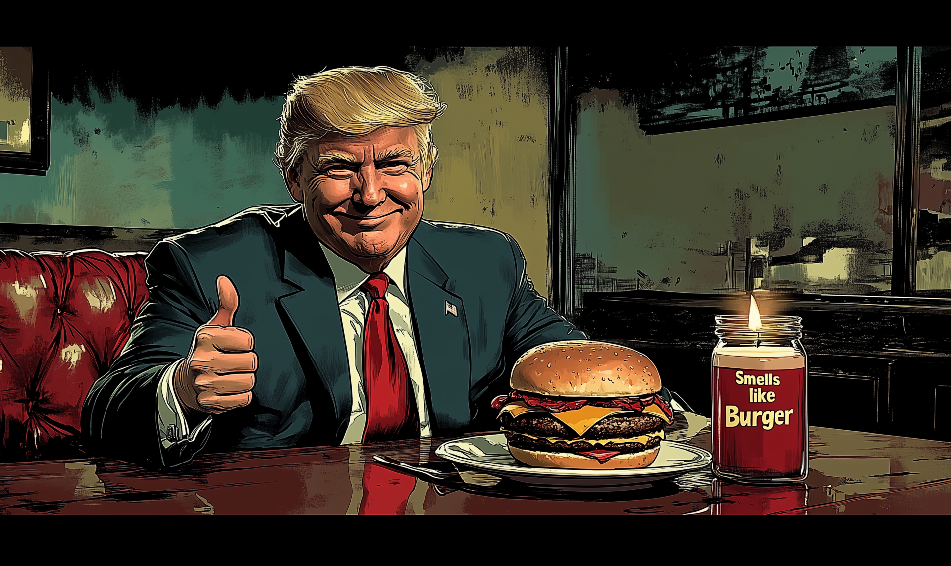 This illustration features a cheerful politician with a distinct orange hue, exuding a jovial demeanor. The character is holding a Big Mac, adding a touch of humor and playfulness to the artwork.