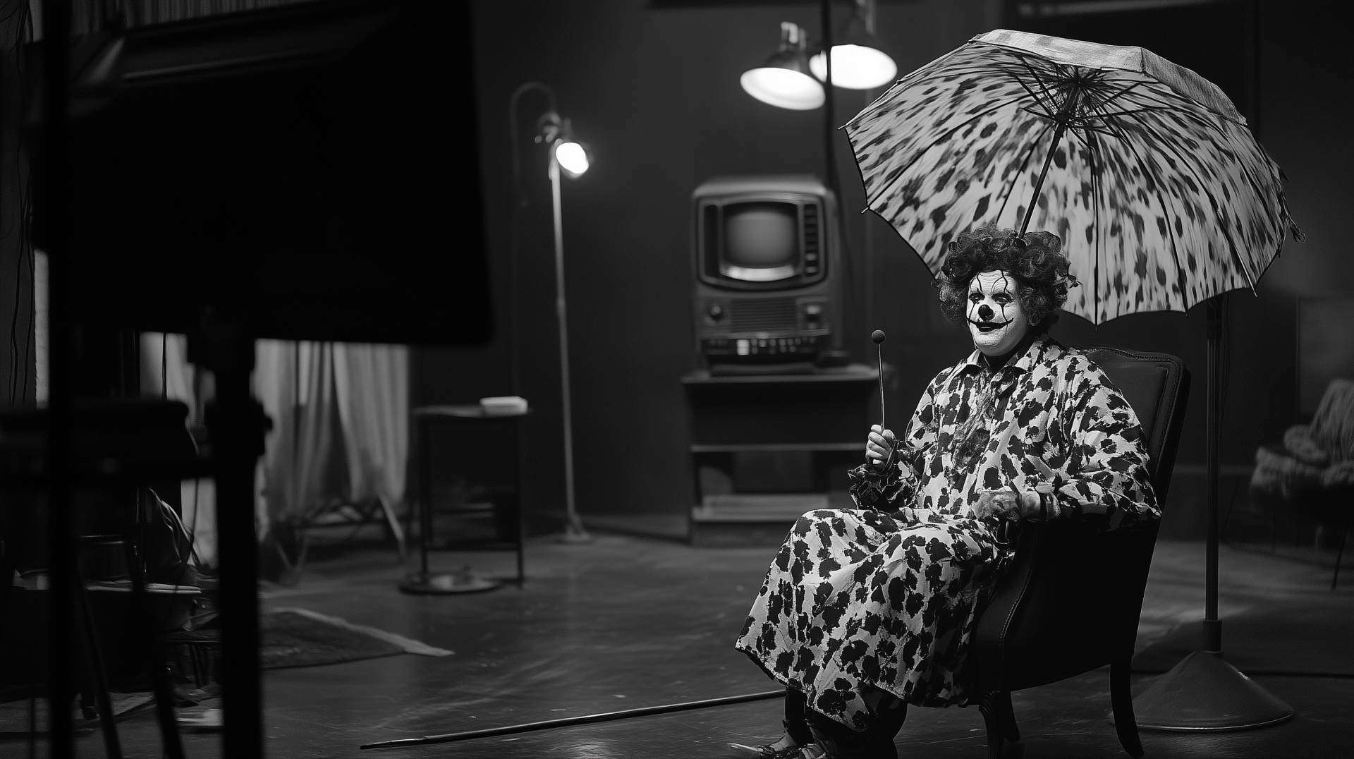 A whimsical black and white clown delivers the news from a modern TV studio, adding humor to the serious setting. The clown holds an umbrella, which accentuates the playful contrast between news broadcasting and circus entertainment.