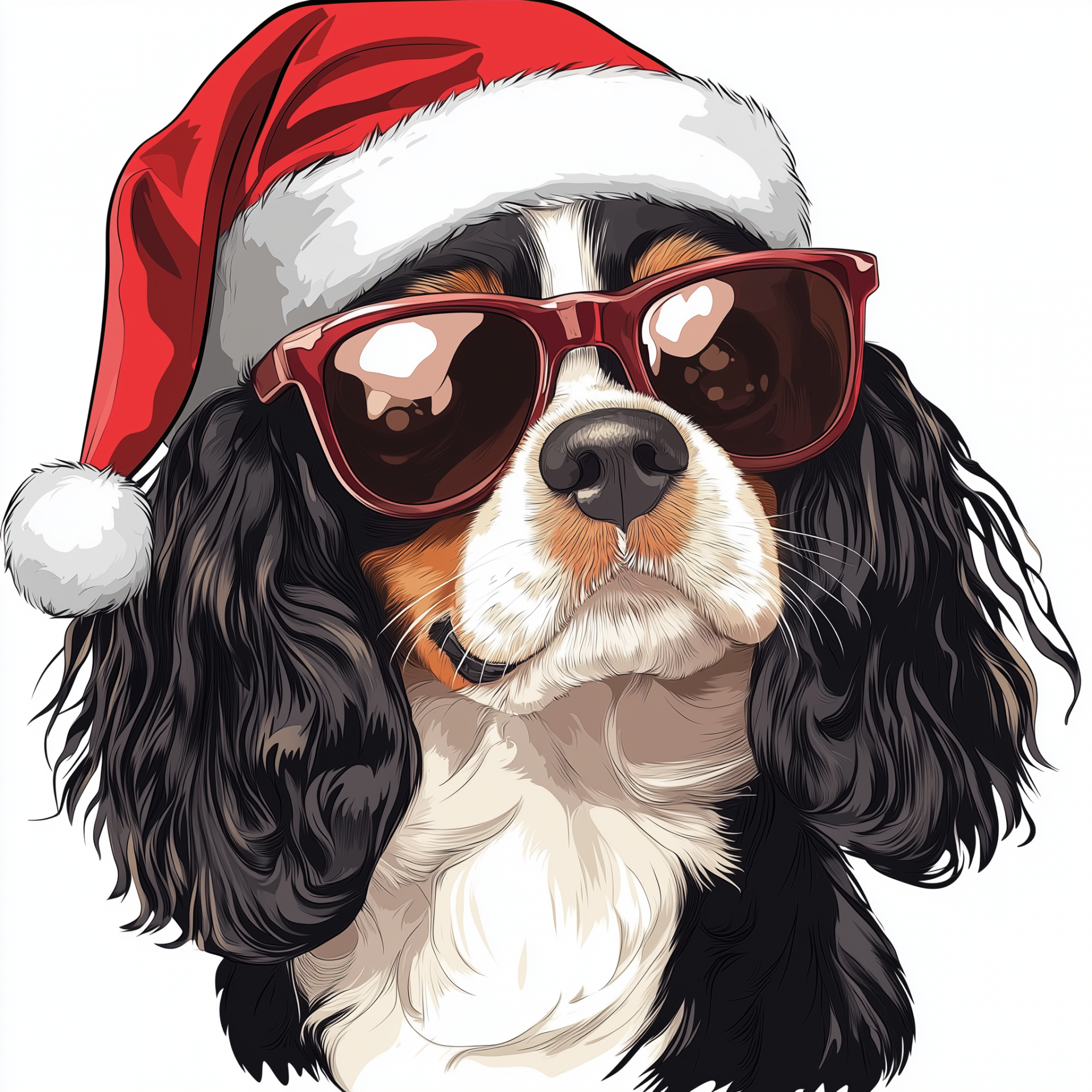 This illustration features a charming cavalier king charles spaniel adorned with a santa hat and sunglasses. The playful character blends seamlessly into a soft white background, creating a whimsical and festive atmosphere.