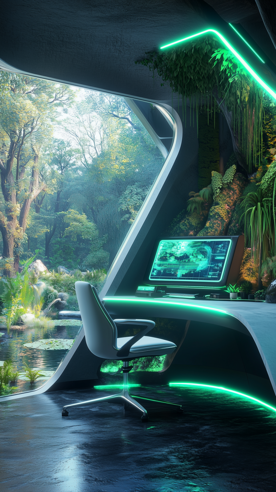 The image showcases a vibrant futuristic city, blending advanced technology with lush greenery. Sleek buildings are intertwined with vertical gardens, creating a harmonious balance between nature and innovation.