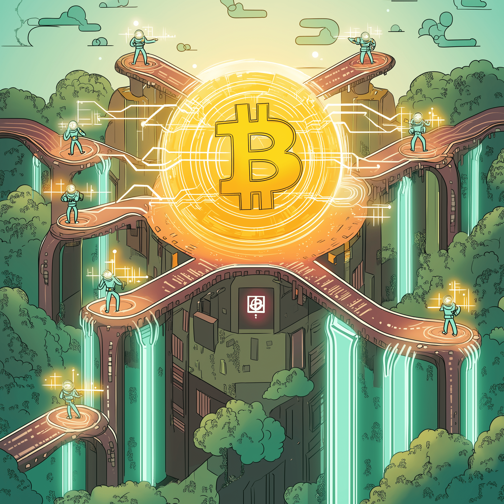 The image depicts a vibrant futuristic digital landscape where a glowing golden Bitcoin symbol stands prominently at the center. Surrounding it are interconnected bridges illuminated by flowing lines, creating a dynamic feeling of asset transfer within a light-colored background.