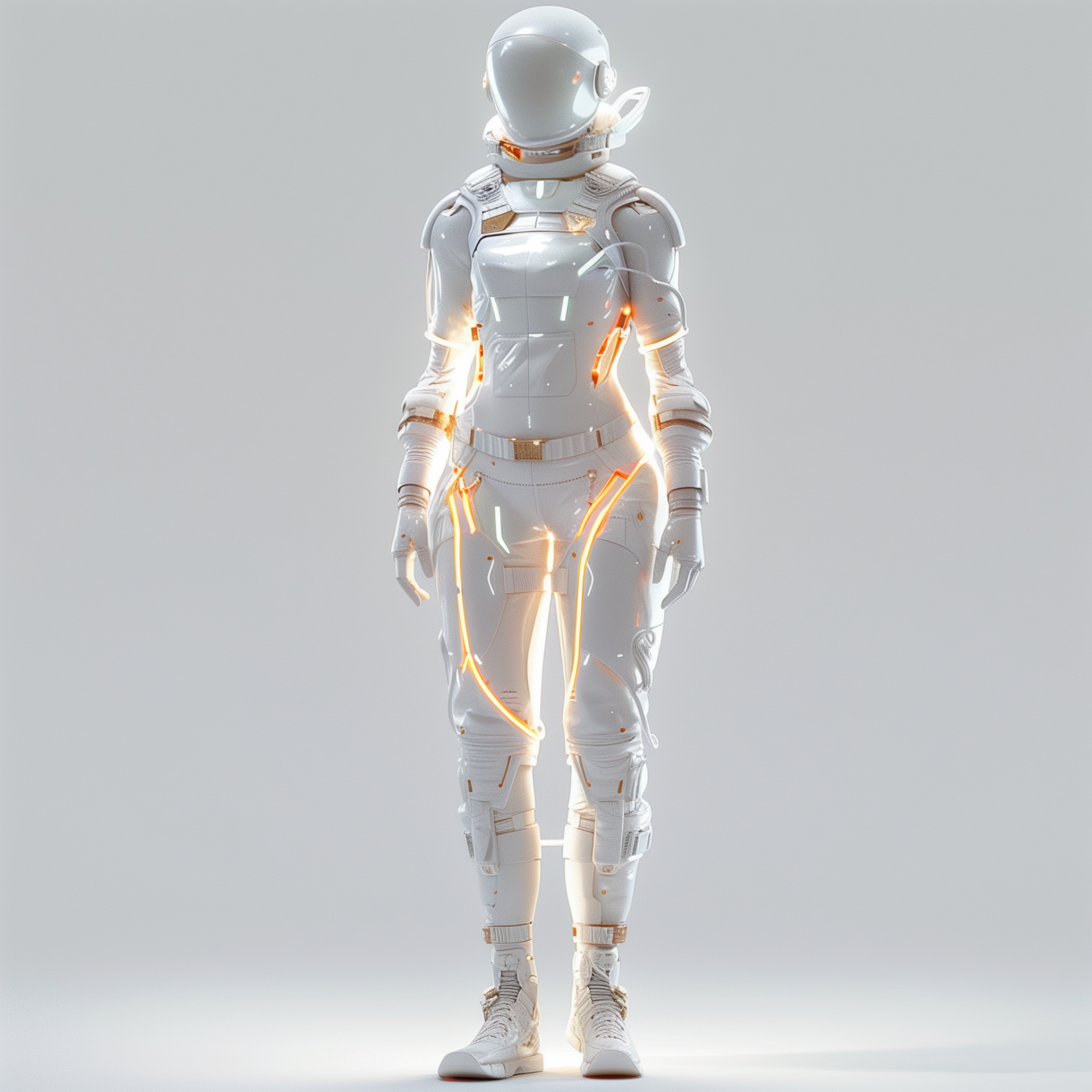 This image features a humanoid woman dressed in a sleek white costume, depicted against a minimalist white background. The full-height front view enhances the futuristic and ethereal quality of the hologram.