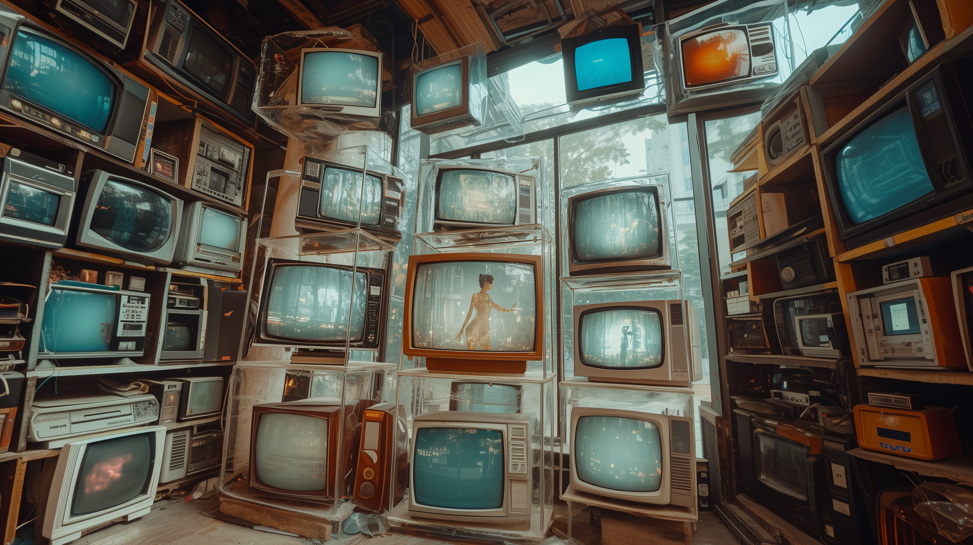 The image presents a nostalgic scene of an antique shop adorned with vintage televisions from the 90s. In the backdrop, the vibrant neon lights of a futuristic Bangkok cityscape create a striking contrast, enveloping the setting in a cinematic ambiance.