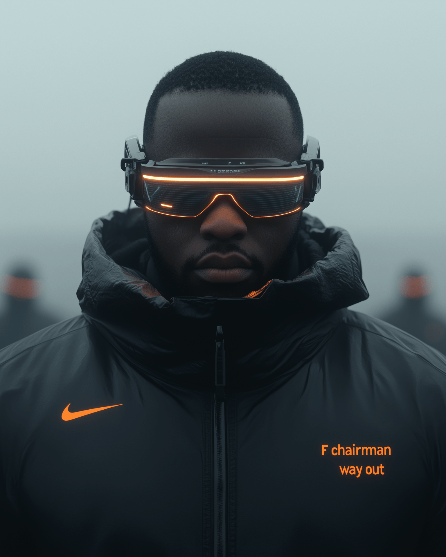 The image showcases a striking scene set in futuristic Paris, enveloped in a foggy ambiance. A confident black male model, adorned in a neon-lit windbreaker, looks directly at the viewer, brandishing an eye-catching orange key that hints at perseverance.