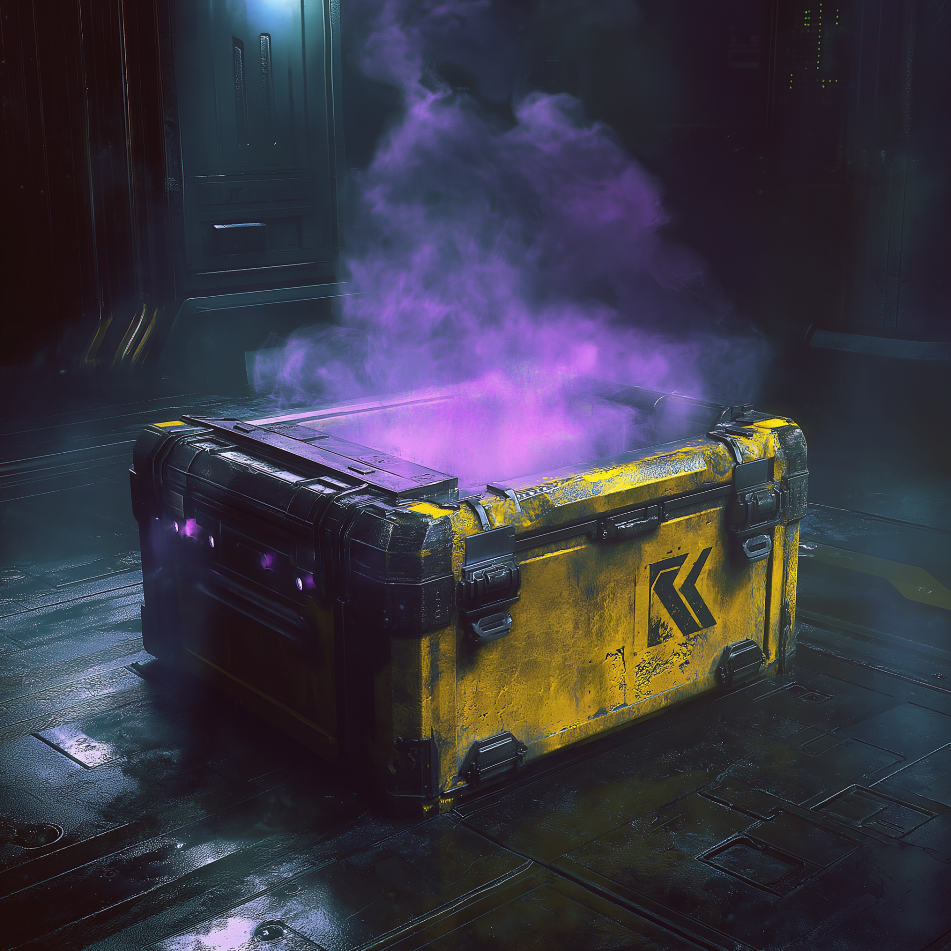The image showcases a futuristic metallic loot crate that has crashed onto a dark, industrial spaceship floor. It emits a vibrant purple glow from within, creating a striking contrast against the surrounding shadows.