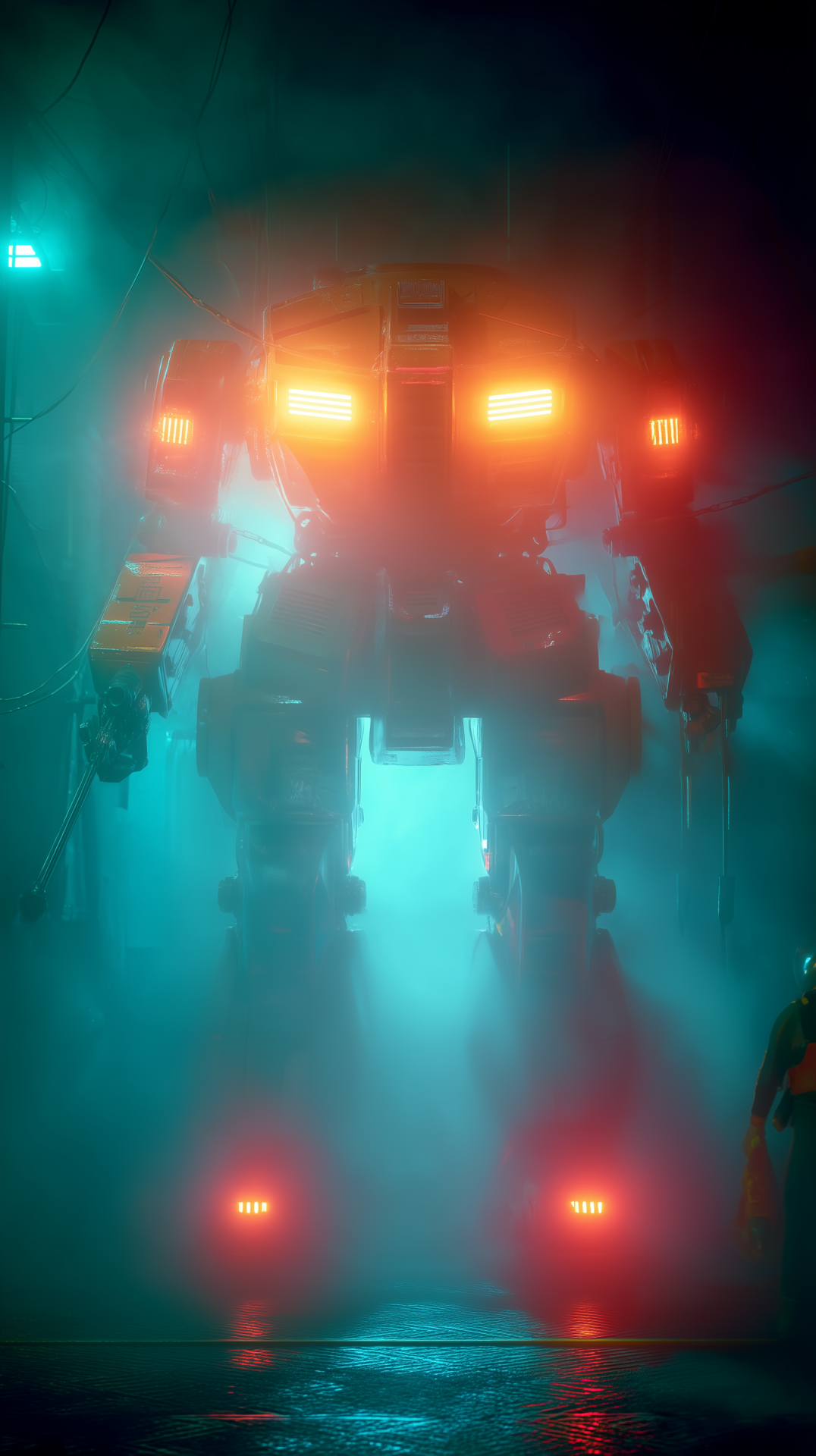 The image depicts a mobile suit illuminated by vibrant neon LED lighting in a chaotic war zone. Thick atmospheric fog and laser beams create a gritty yet visually striking ambiance.