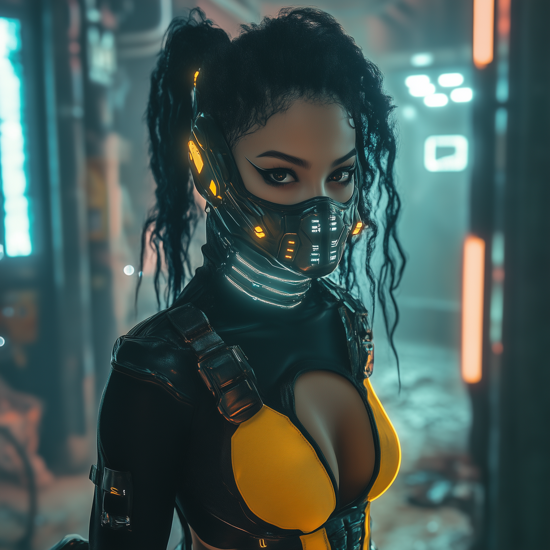 The image features a model dressed in futuristic tech wear, showcasing an edgy and modern style. The vibrant colors and sleek lines evoke a strong cyberpunk aesthetic, blending high fashion with a sci-fi vibe.