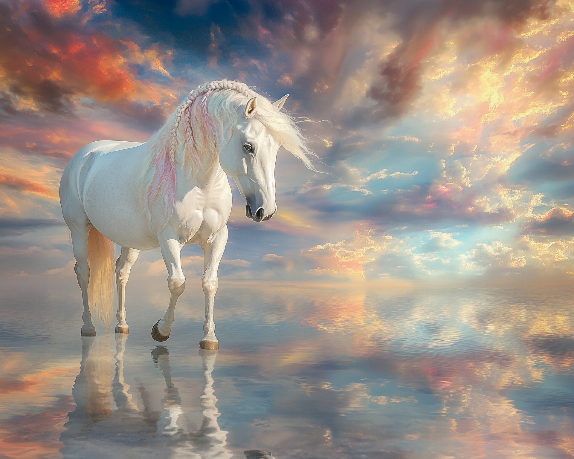 This image showcases a stunning white dressage horse with a beautifully braided mane set against a futuristic backdrop. The composition is inspired by avant-garde photography, evoking a sense of modern artistry and elegance.