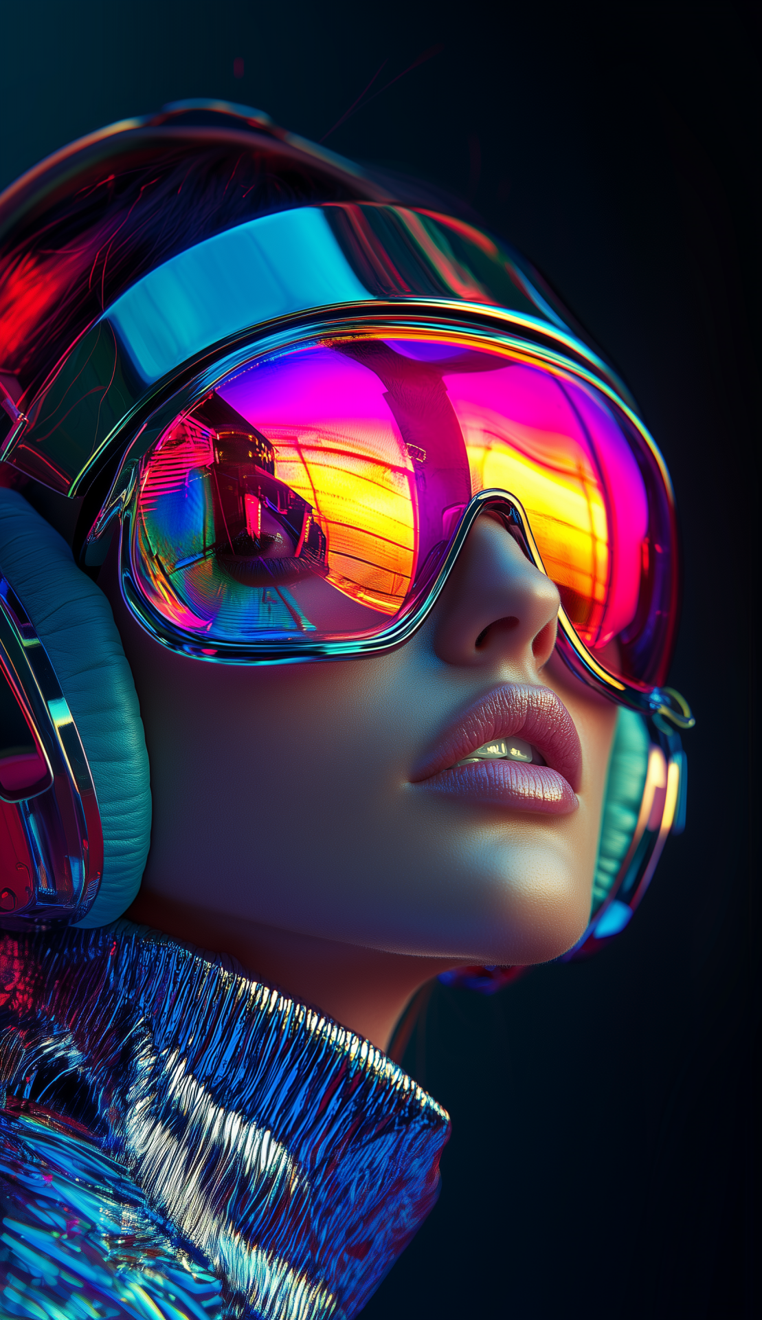 This image features a futuristic woman adorned in a colorful glass helmet combined with stylish headphones and glasses. The vibrant colors and sleek design create a modern and energetic vibe.