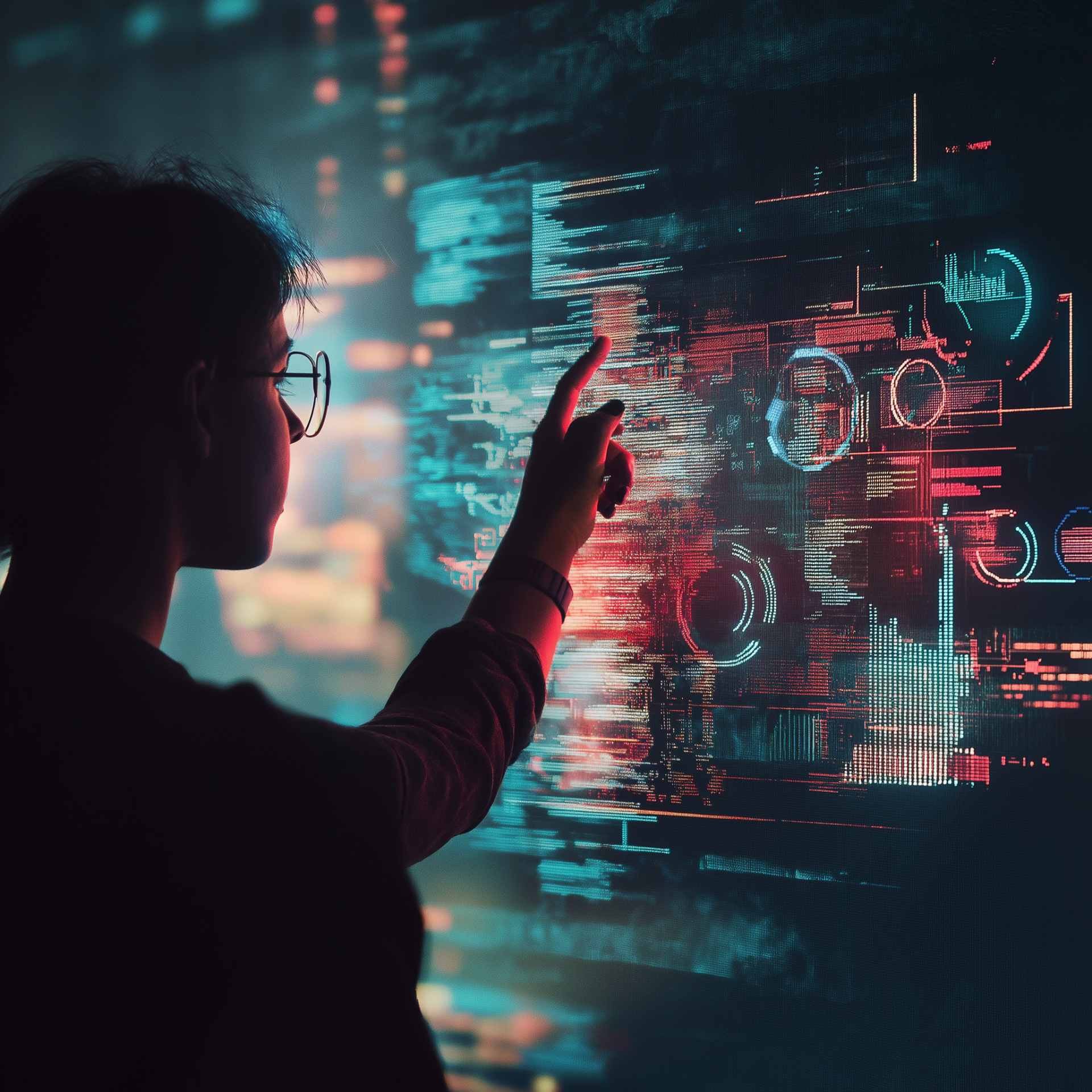 The image depicts a person immersed in a vibrant, abstract environment while gazing at a futuristic screen. The engaging colors and painted style create a dynamic and modern atmosphere, highlighting the innovative financial app interface.