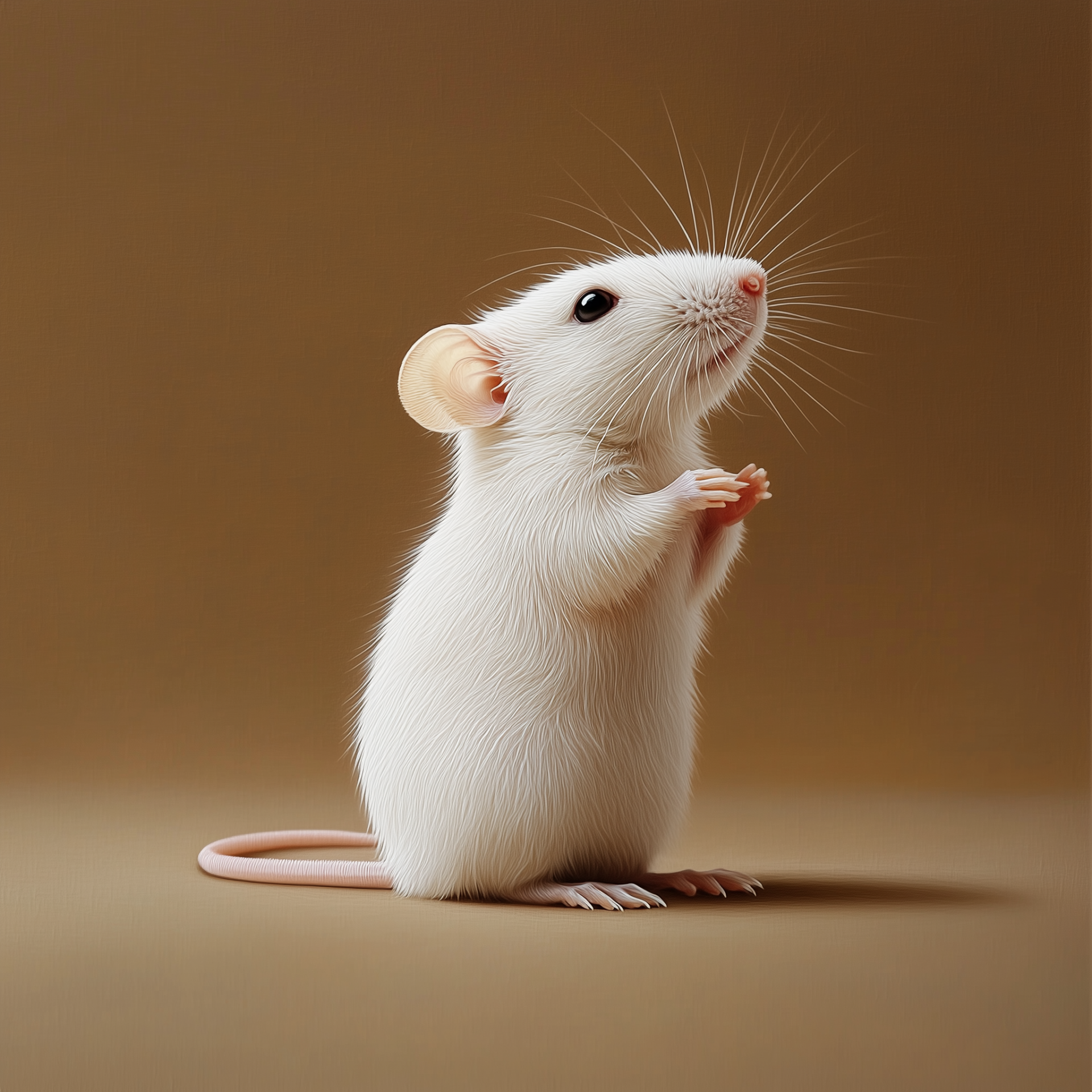 The image features a fuzzy white mouse resting peacefully on its hind legs. It faces to the right and gazes slightly upwards against a simple brown background.