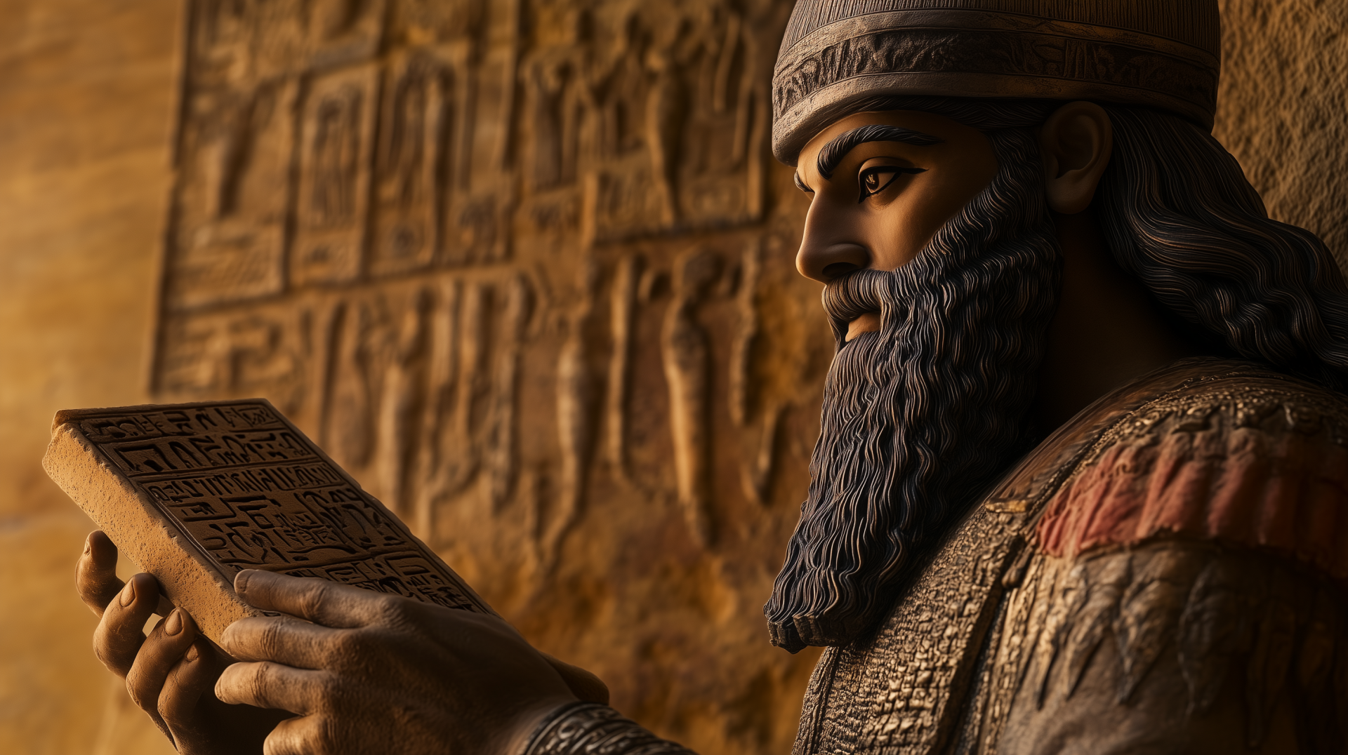 The image depicts an impressive fleet of ancient skyships soaring from the sandy lands of Mesopotamia. Leading the way is a tall, regal figure adorned in a horned helmet and shimmering robe, creating an atmosphere of mystique and grandeur.