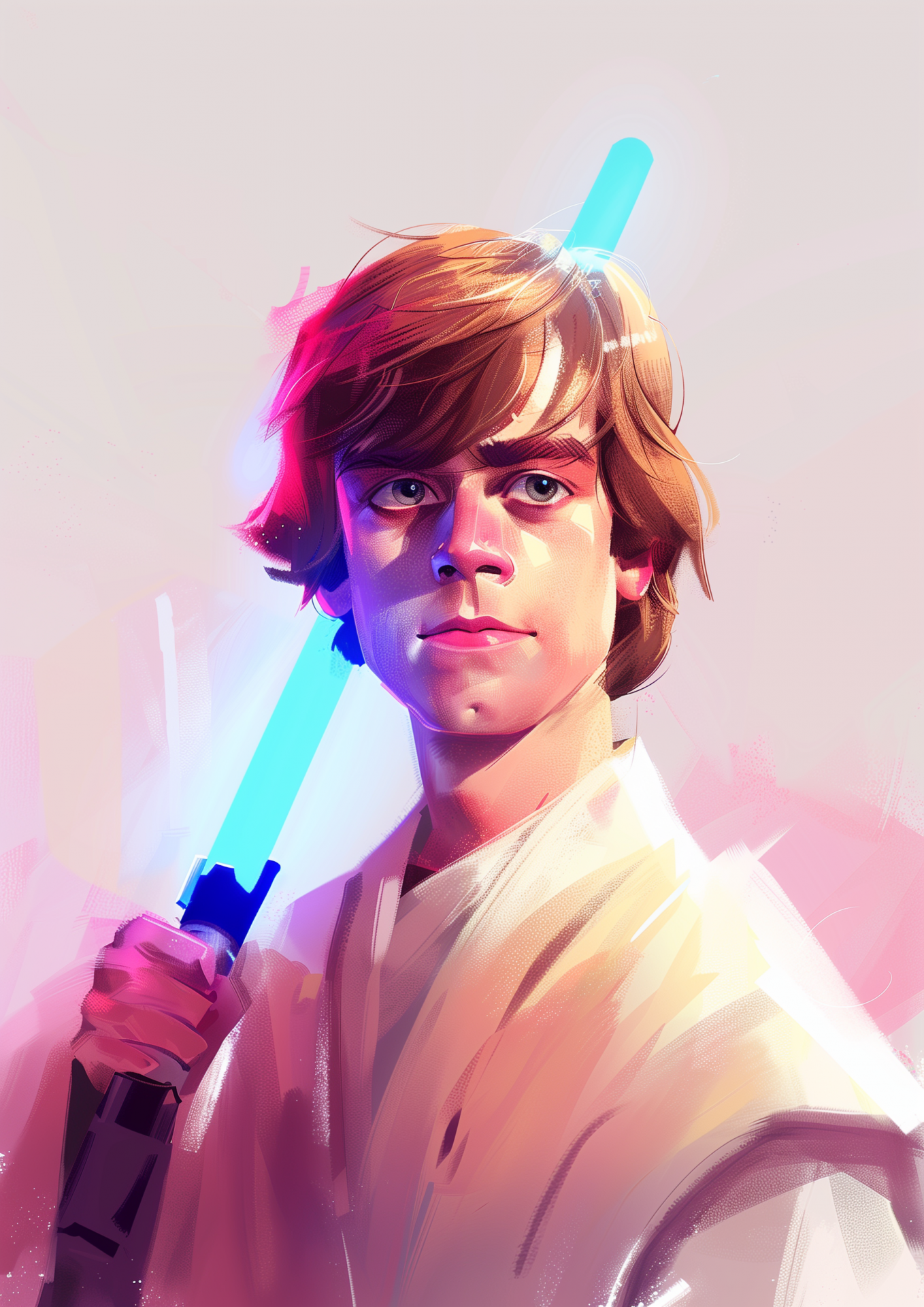 A vibrant illustration captures a young Jedi, poised with a blue lightsaber. The character is depicted in a dynamic stance, conveying a sense of energy and adventure in a galaxy far away.
