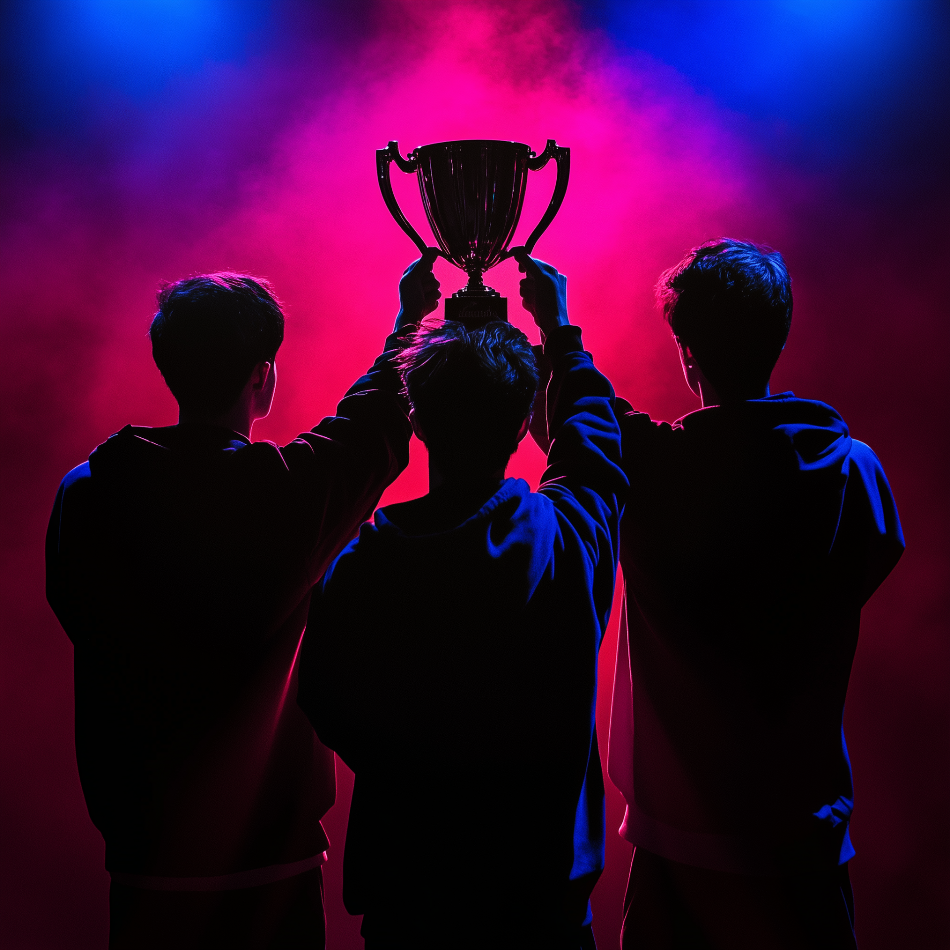 This captivating photograph showcases three gamers viewed from behind, lifting a trophy high above their heads in a moment of triumph. The image is enhanced by a vibrant ambiance of red, blue, and purple colors, adding a celebratory feel to the scene.