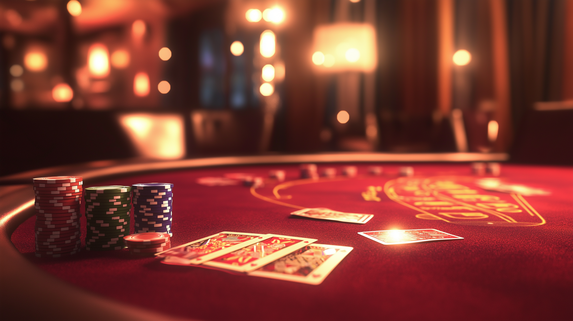 This image showcases a photorealistic poker table set with chips and playing cards. The lighting and blur effects add depth and atmosphere to the scene, creating an inviting ambiance for a game night.