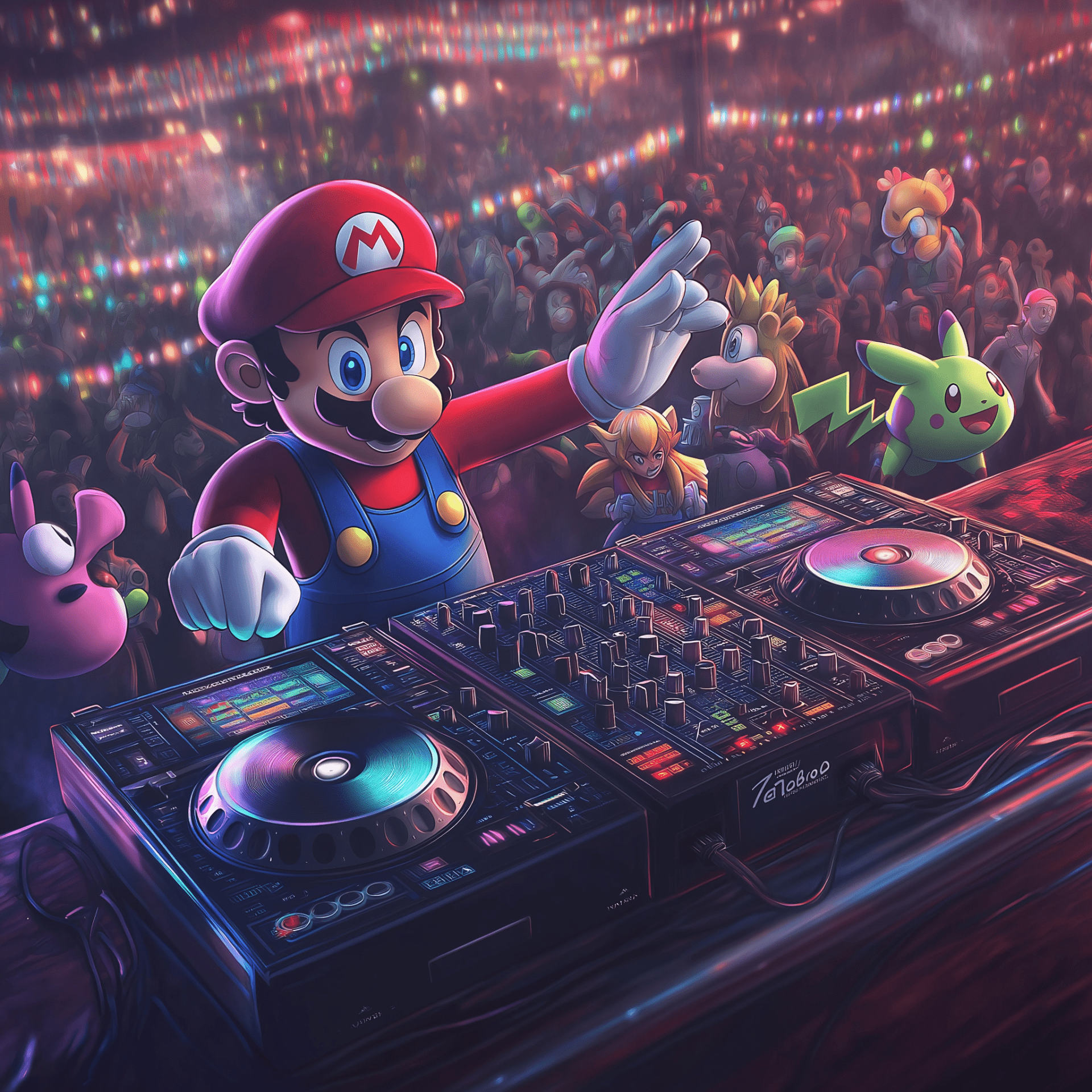 The image depicts a vibrant rave scene with a DJ booth where a character is spinning records. Colorful lights illuminate the dance floor filled with various iconic video game characters enjoying the lively atmosphere.