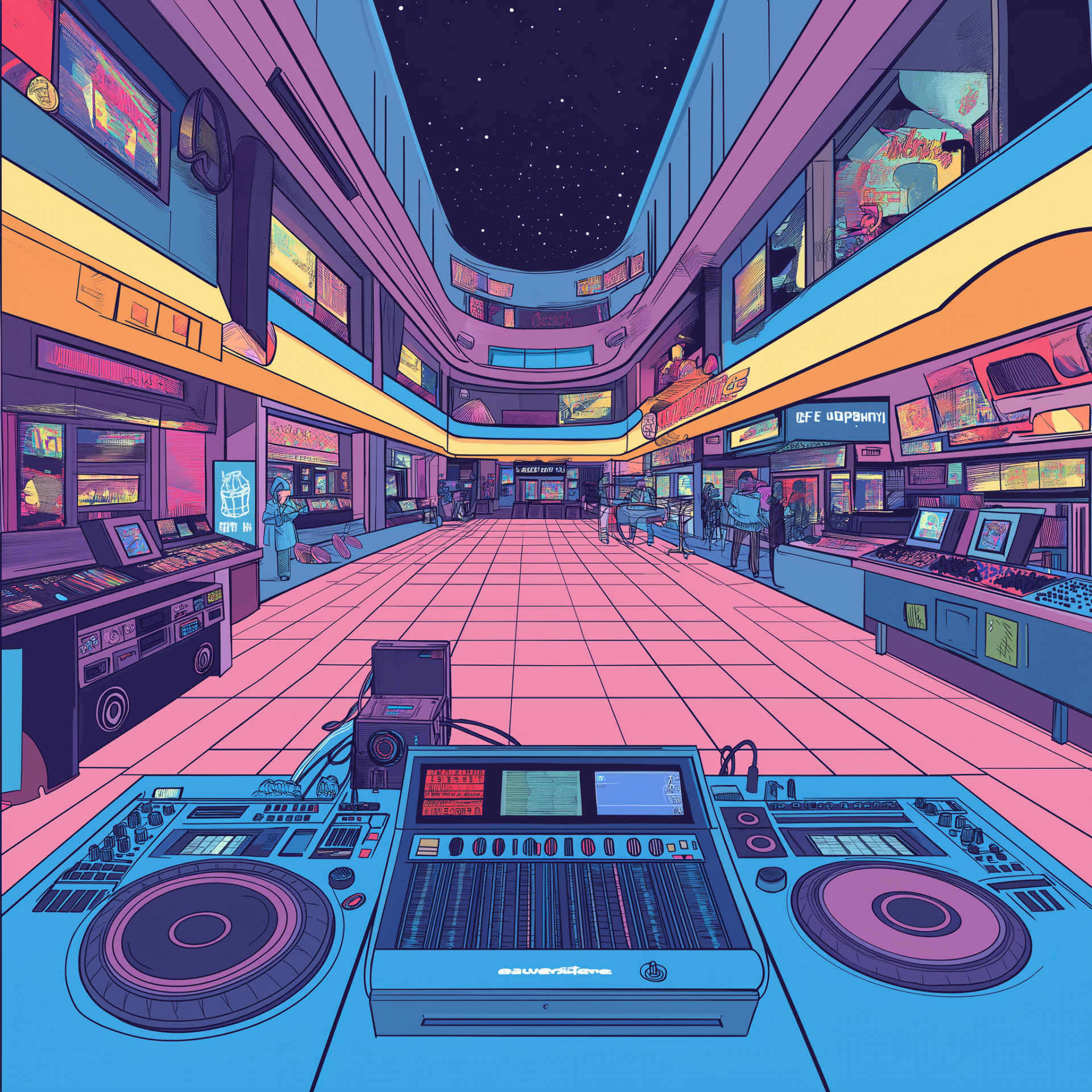 The illustration depicts a vibrant, colorful mall setting inspired by iconic video games, designed in a nineties Saturday morning cartoon style. Large open space in the center allows for text, while various gaming elements like a DJ mixer, CDJs, and speakers are arranged throughout the scene.