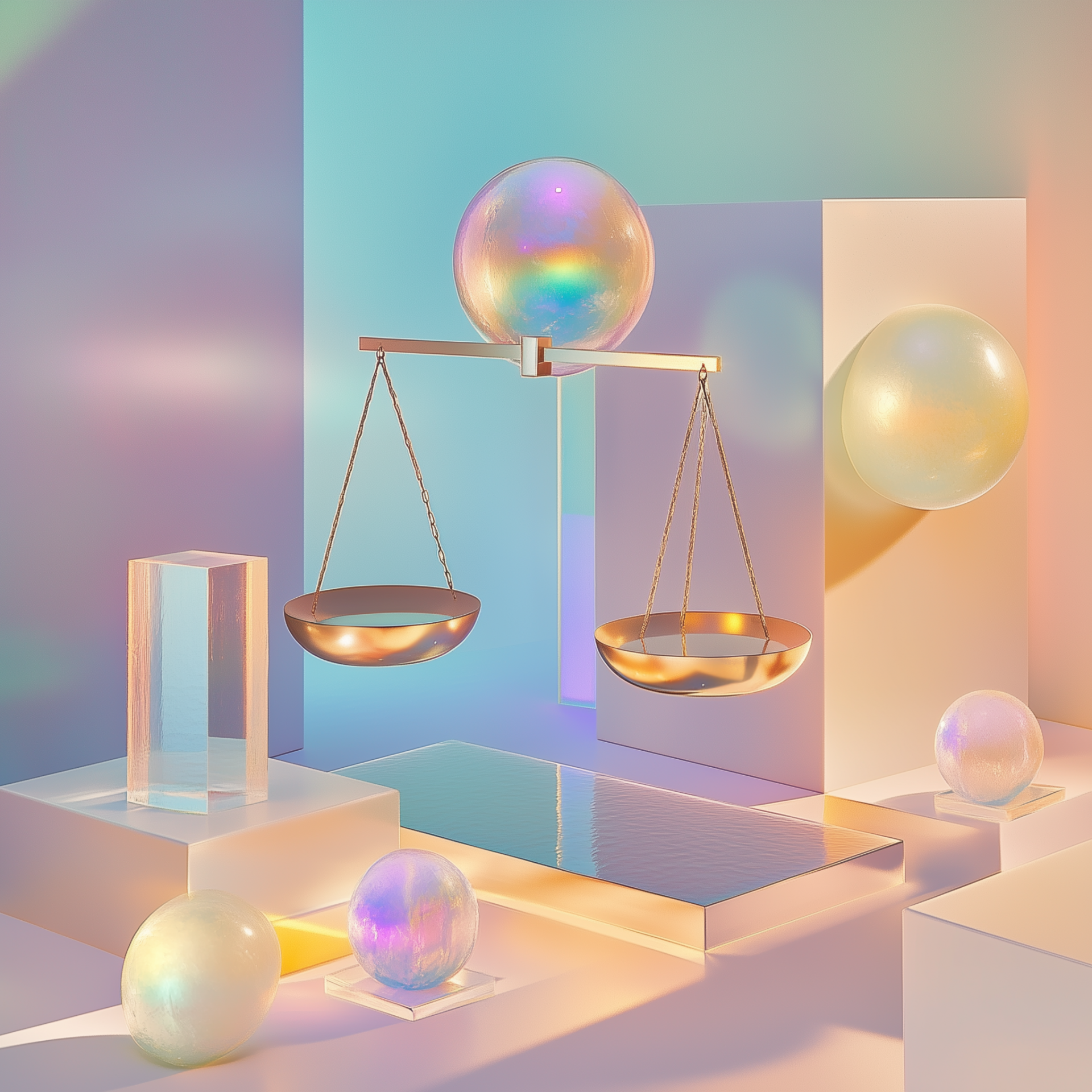 This image showcases a surreal still life where a balance scale made of geometric shapes floats gracefully in a pastel background. The iridescent and moon-like spheres on either side create a cosmic atmosphere, enhanced by soft lighting and delicate reflections.