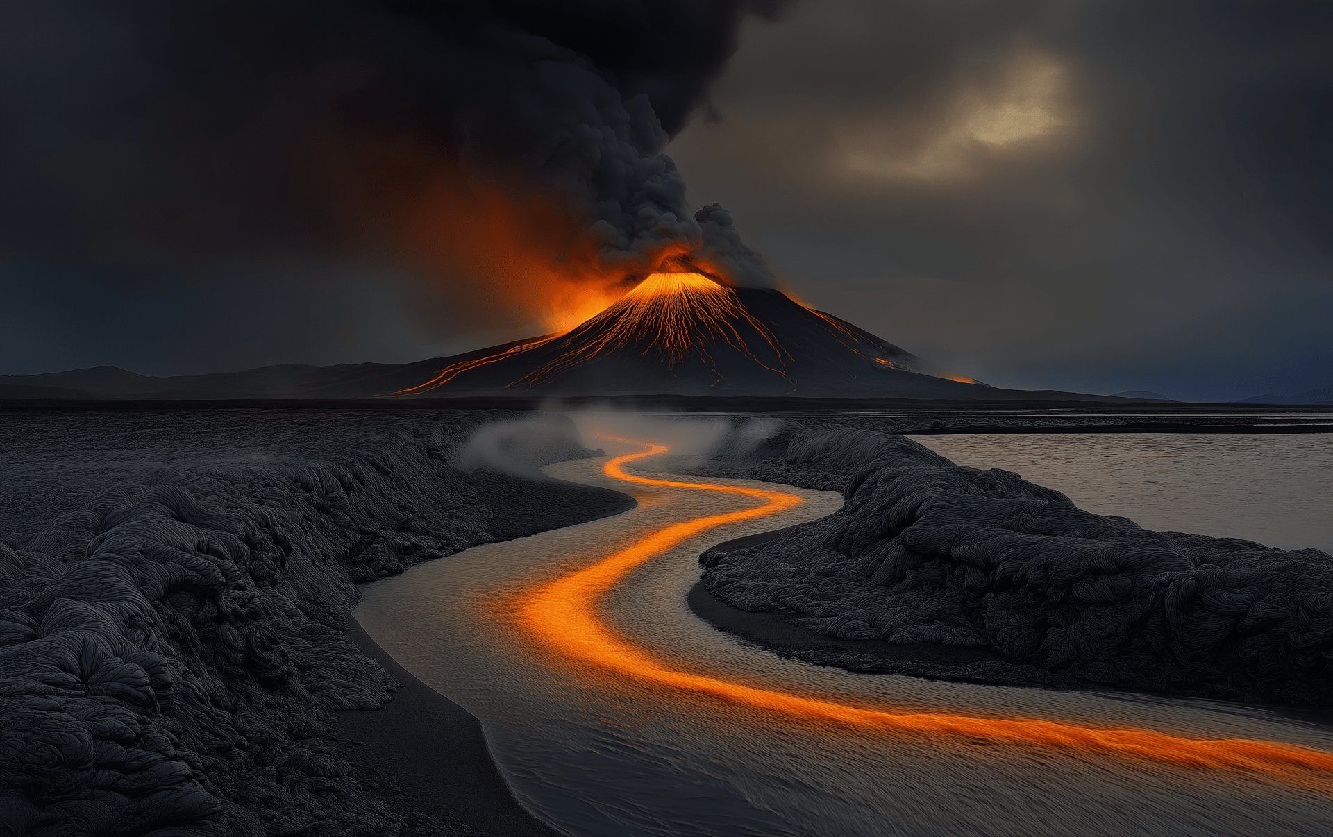 This stunning photograph captures the dramatic scene of a volcanic eruption illuminated by the Milky Way. Streams of glowing lava flow across a dark rock valley, highlighting the contrast between light and darkness in a mesmerizing display of nature's power.