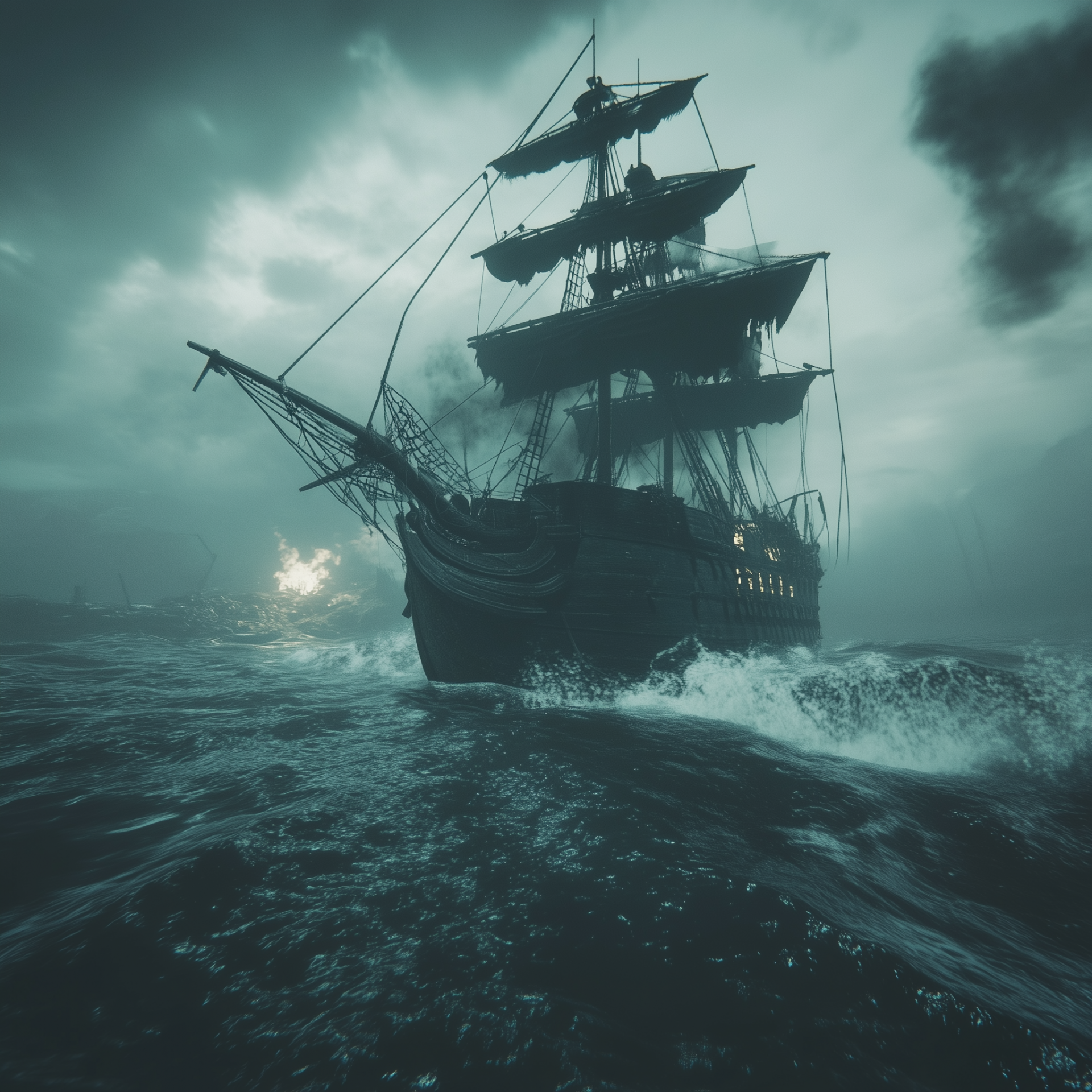 The image captures a ghostly pirate ship viewed from behind, sailing through tumultuous waters. Ominous skies loom overhead while waves crash dramatically against the vessel, creating a sense of adventure and danger.