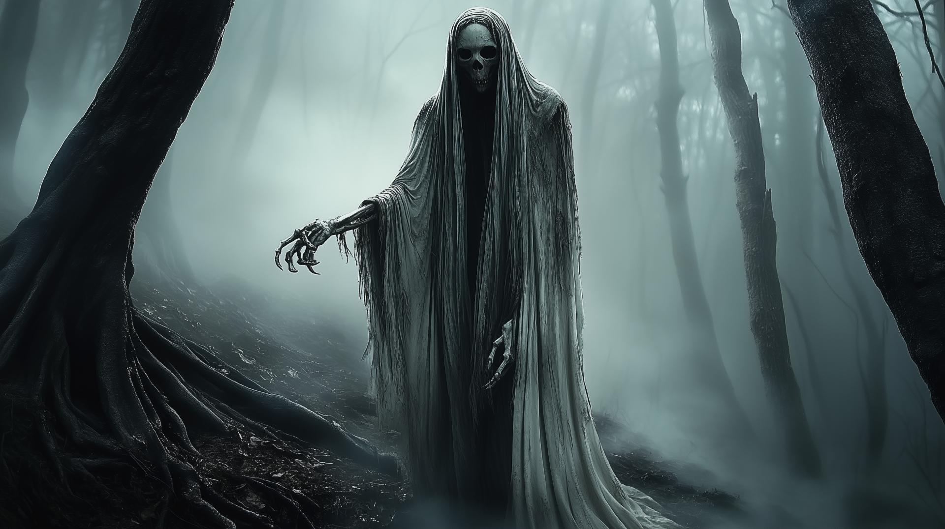 A tall, spectral figure stands motionless at the edge of a misty forest. Dressed in flowing, tattered robes, it exudes an eerie atmosphere with muted gray tones and cold fog drifting through twisted trees.