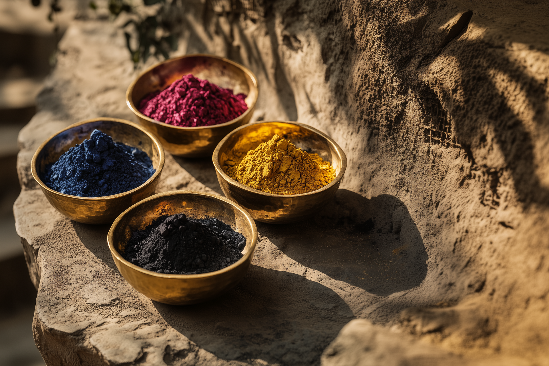 This image features large gold bowls filled with vibrant natural pigments resting on an egyptian sandstone ledge. The warm, golden light filters through foliage, creating dynamic shadows that enhance the rich textures and colors in the scene.