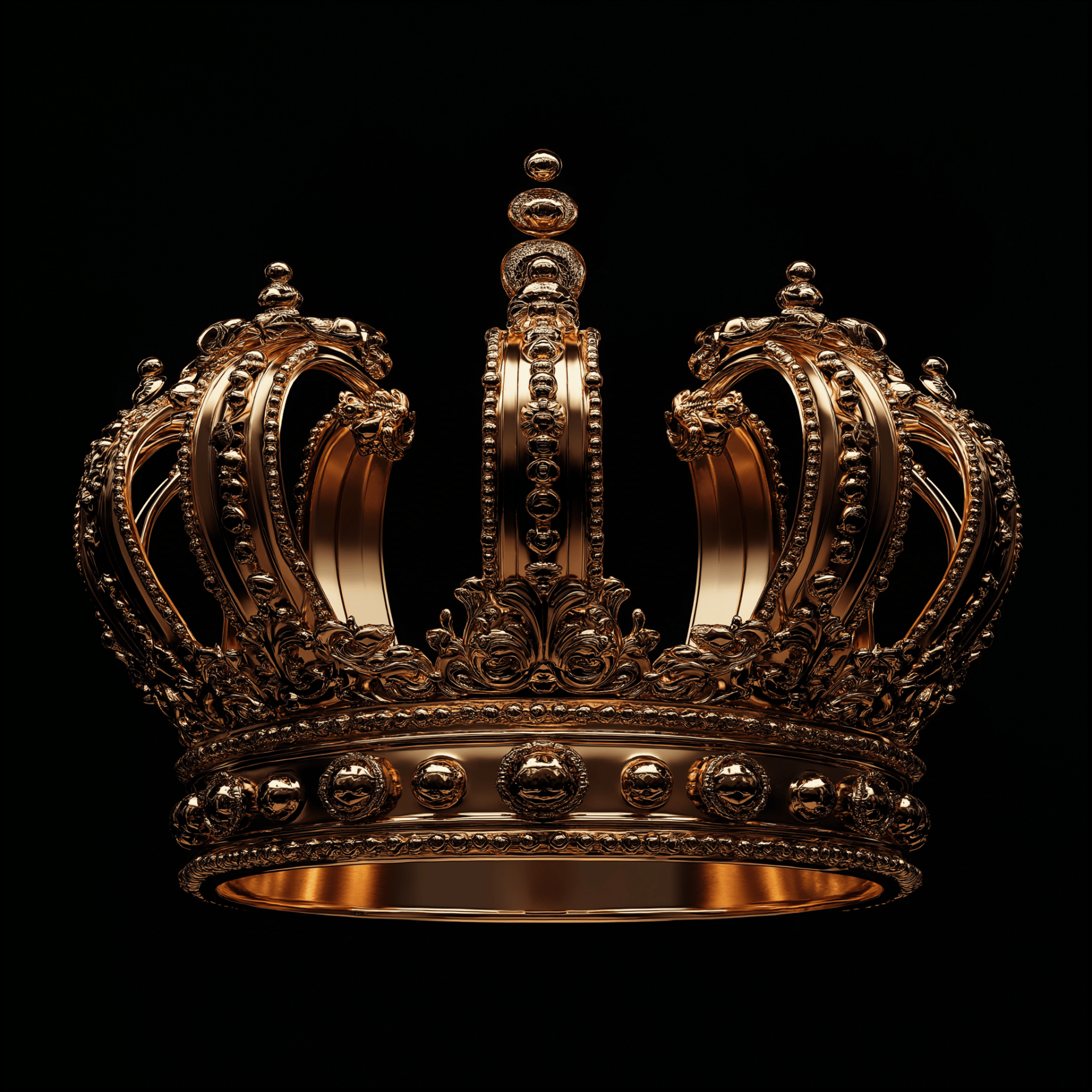 This image showcases a solid gold crown captured from a straight-on view, emphasizing its intricate design. The striking golden hues create a dramatic and regal atmosphere, highlighting its craftsmanship and opulence.