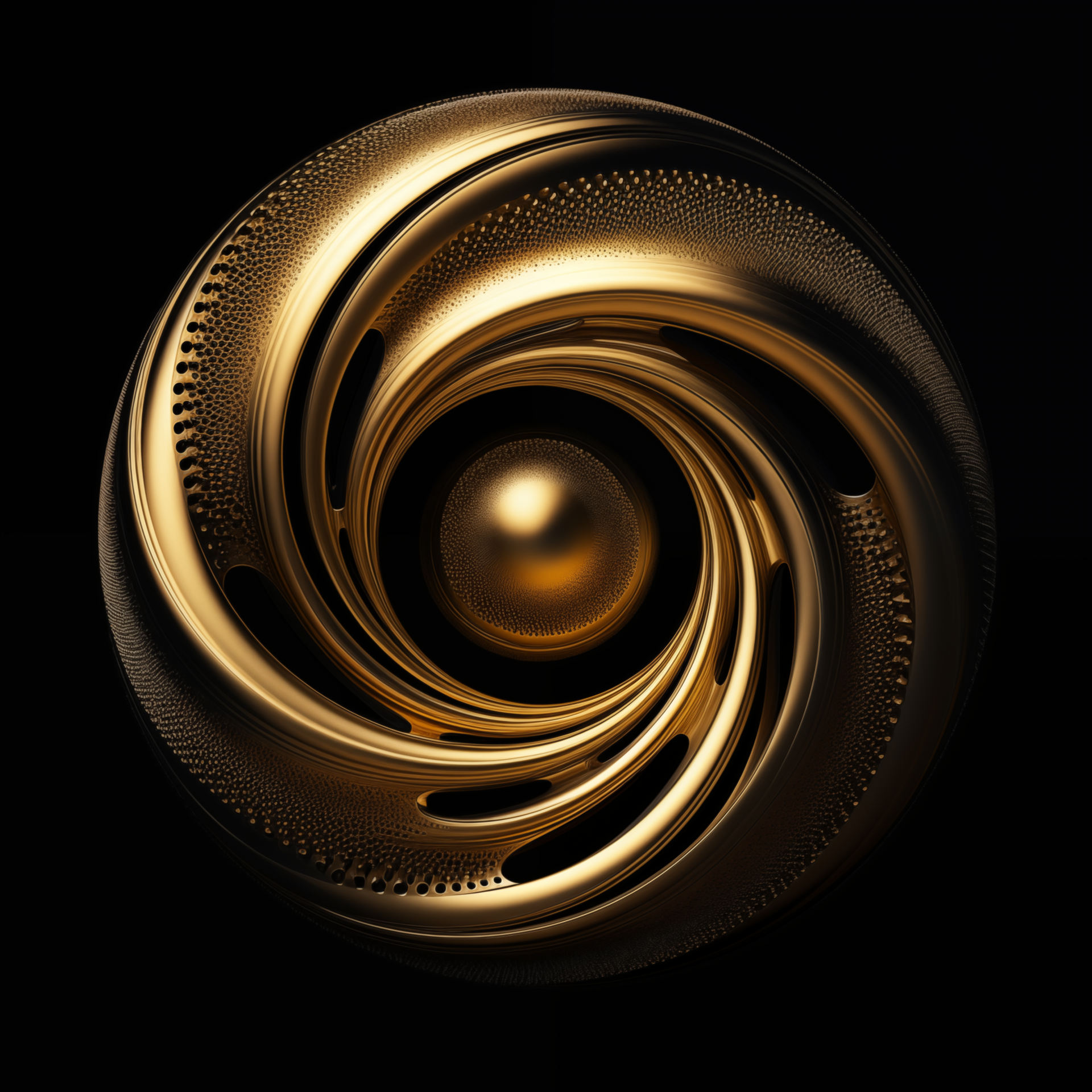 A stunning round fractal object glimmers in gold against a simple black background. The intricate details and high definition create a captivating visual experience that draws the viewer's attention.