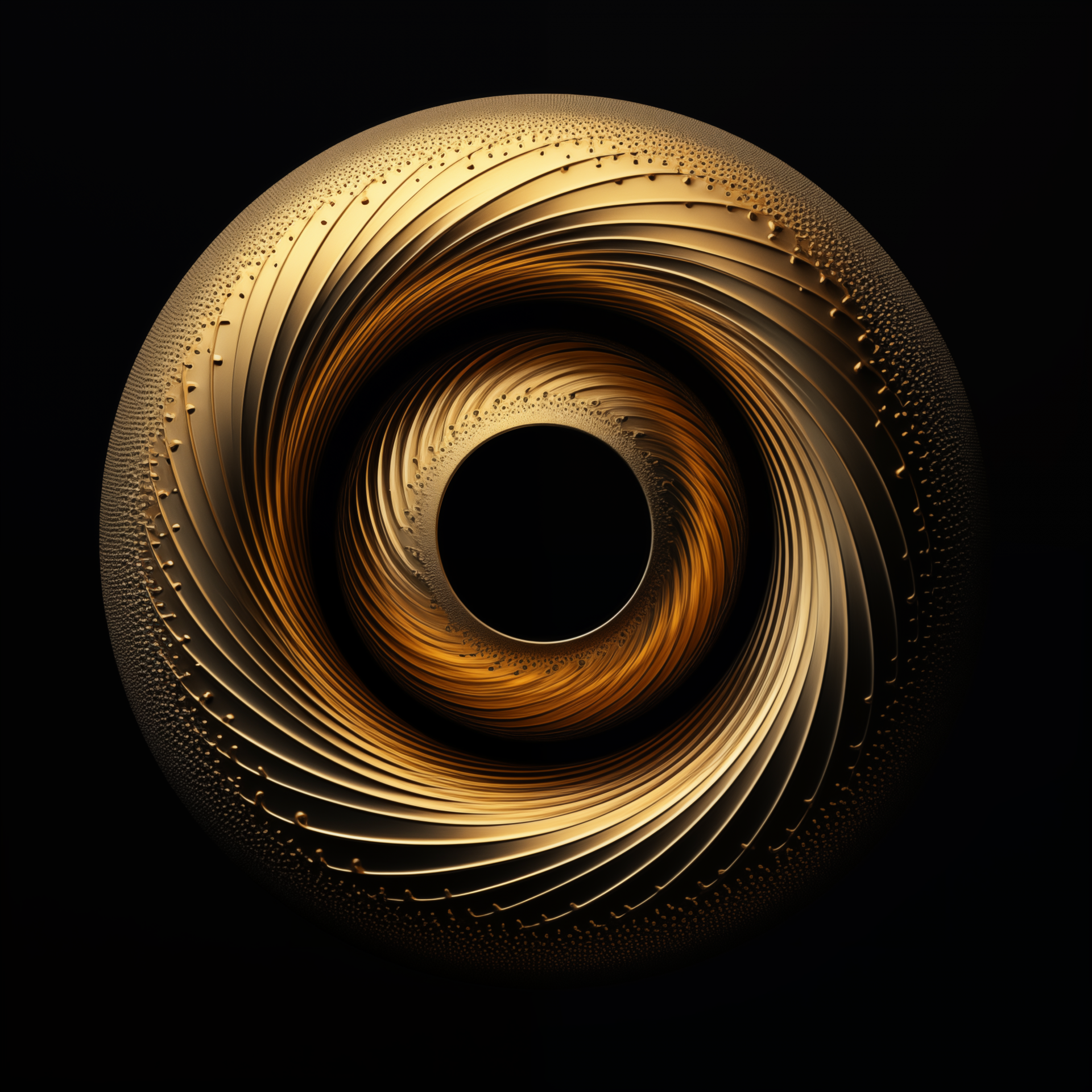 This image features a beautifully crafted round fractal object made of shimmering gold, set against a minimalistic black background. The high detail and 3D representation give it a luxurious and captivating appeal.