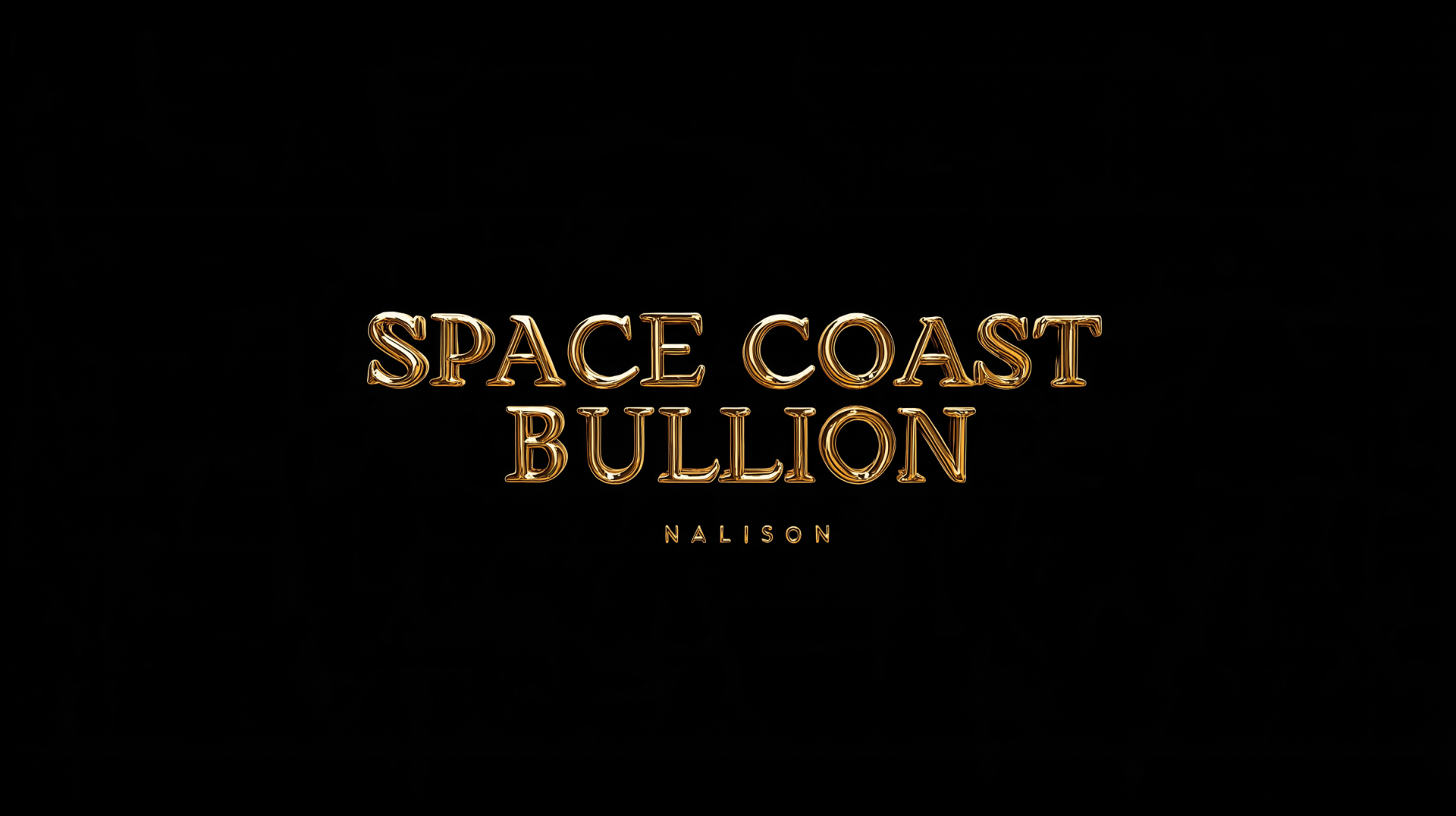 This image displays a striking 3D text that reads 'Space Coast Bullion' crafted from solid gold metal. Set against a deep black background, the text is styled in a NASA-inspired font, giving it a bold and futuristic appearance.