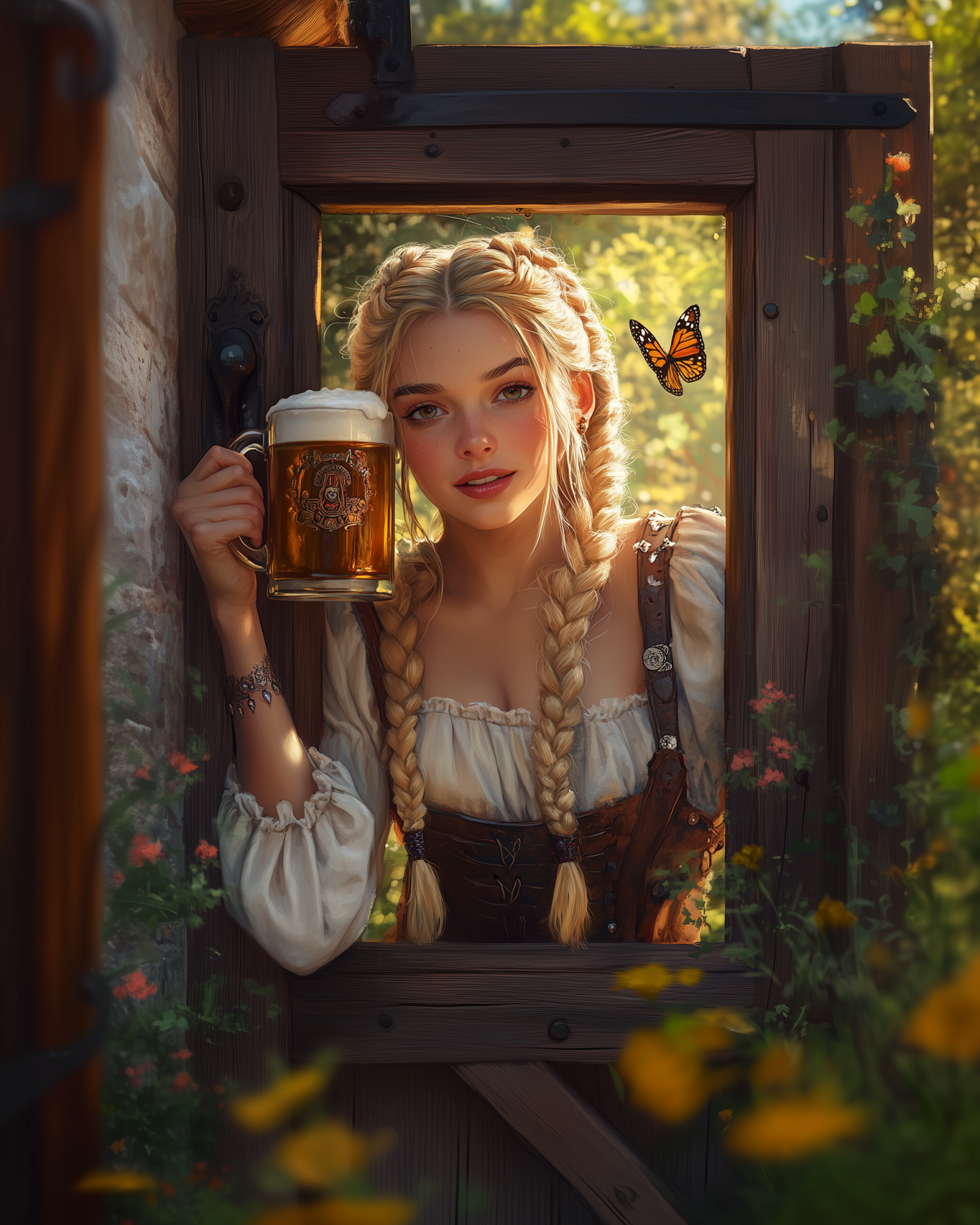 A playful courtesan with thick braided blond hair and plump lips is peeking out from a wooden renaissance doorframe. The warm sunlight casts a golden hue over the garden, surrounded by butterflies and evoking a sense of whimsy.