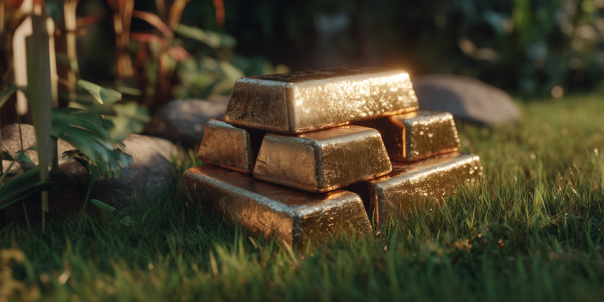 The image showcases shiny gold bars neatly stacked on lush green lawn, illuminated by bright sunlight. It conveys a sense of wealth and luxury, enhanced by a cinematic color grading that adds vibrancy to the scene.