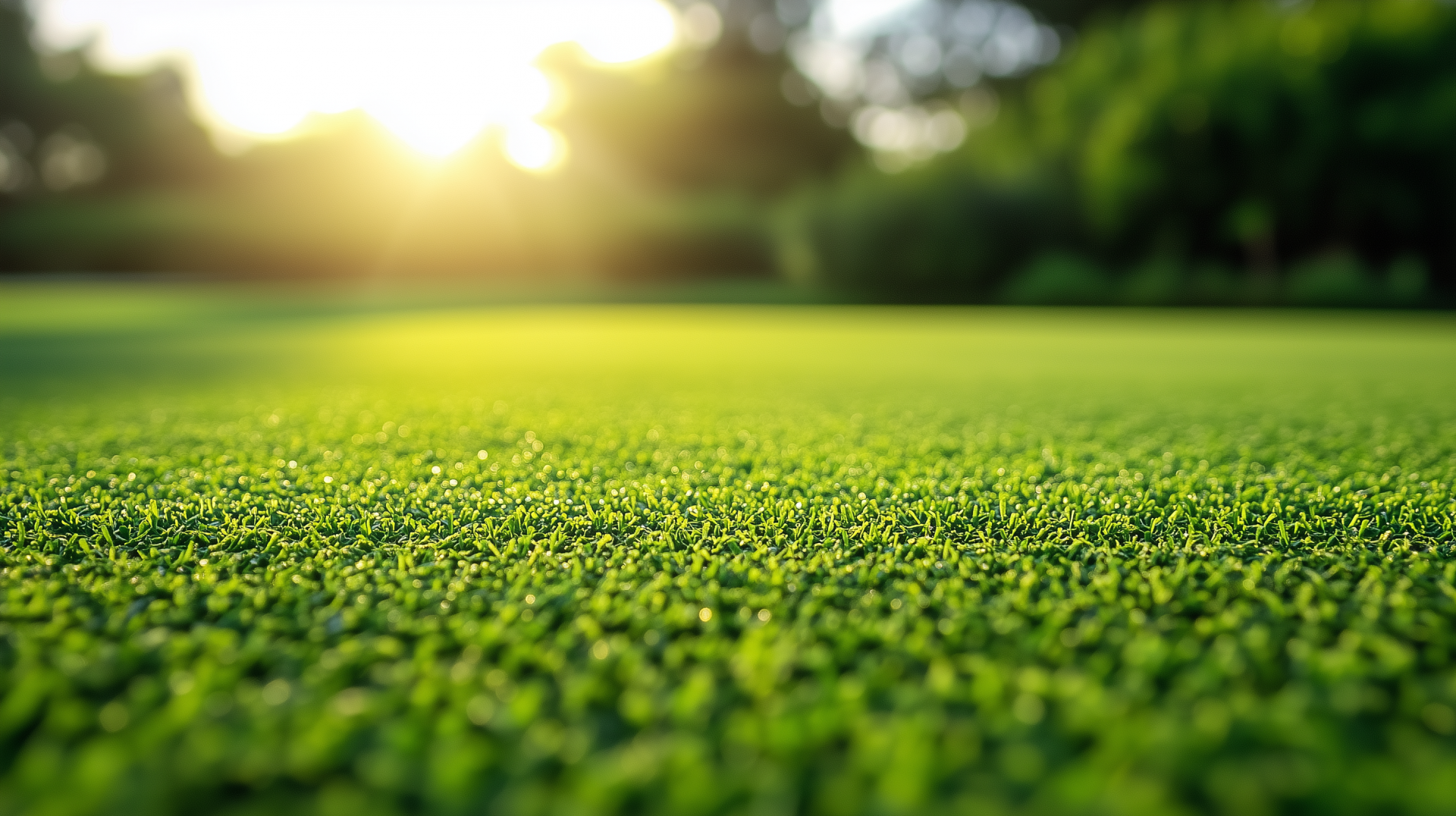 The image captures a vibrant golf course basking in the warm sunlight of a clear morning. The lush green grass is vivid, while the blurred background creates a serene and peaceful atmosphere.