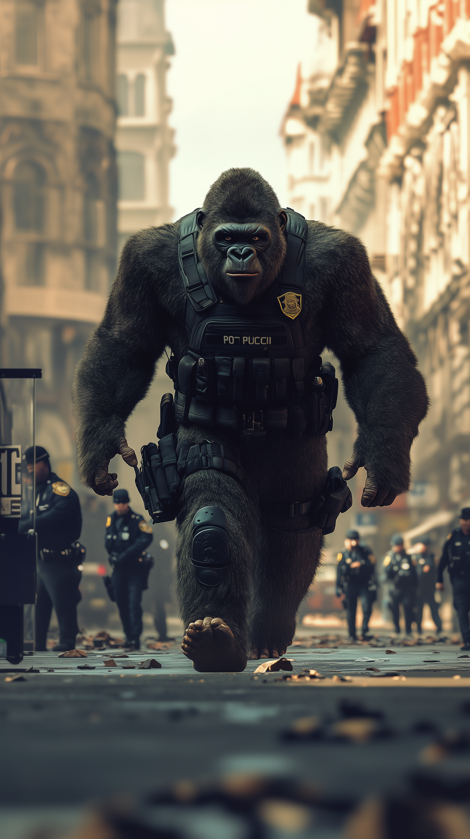 The image showcases a striking fusion of a gorilla and a police officer walking confidently away from the viewer. The ultra-realistic style emphasizes lifelike textures and details, set against the backdrop of a police station.