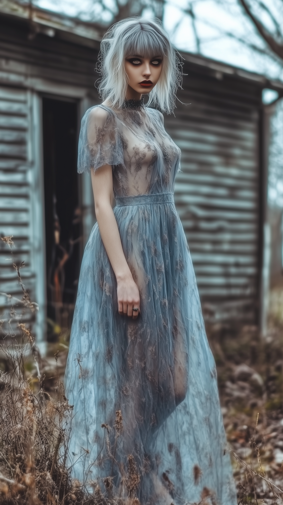 This image showcases a full body shot of an individual dressed in striking gray goth attire. The style exudes a dark and mysterious vibe, perfect for those looking to explore unique fashion statements.