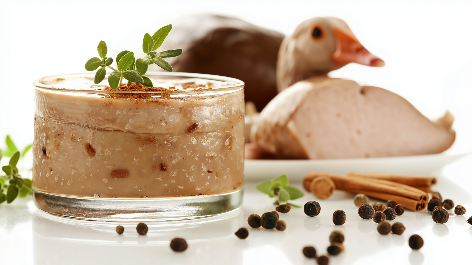 The image captures a round glass filled with rich foie gras, beautifully presented with an array of spices. In the background, a farmed duck adds an earthy touch to the sophisticated culinary display.