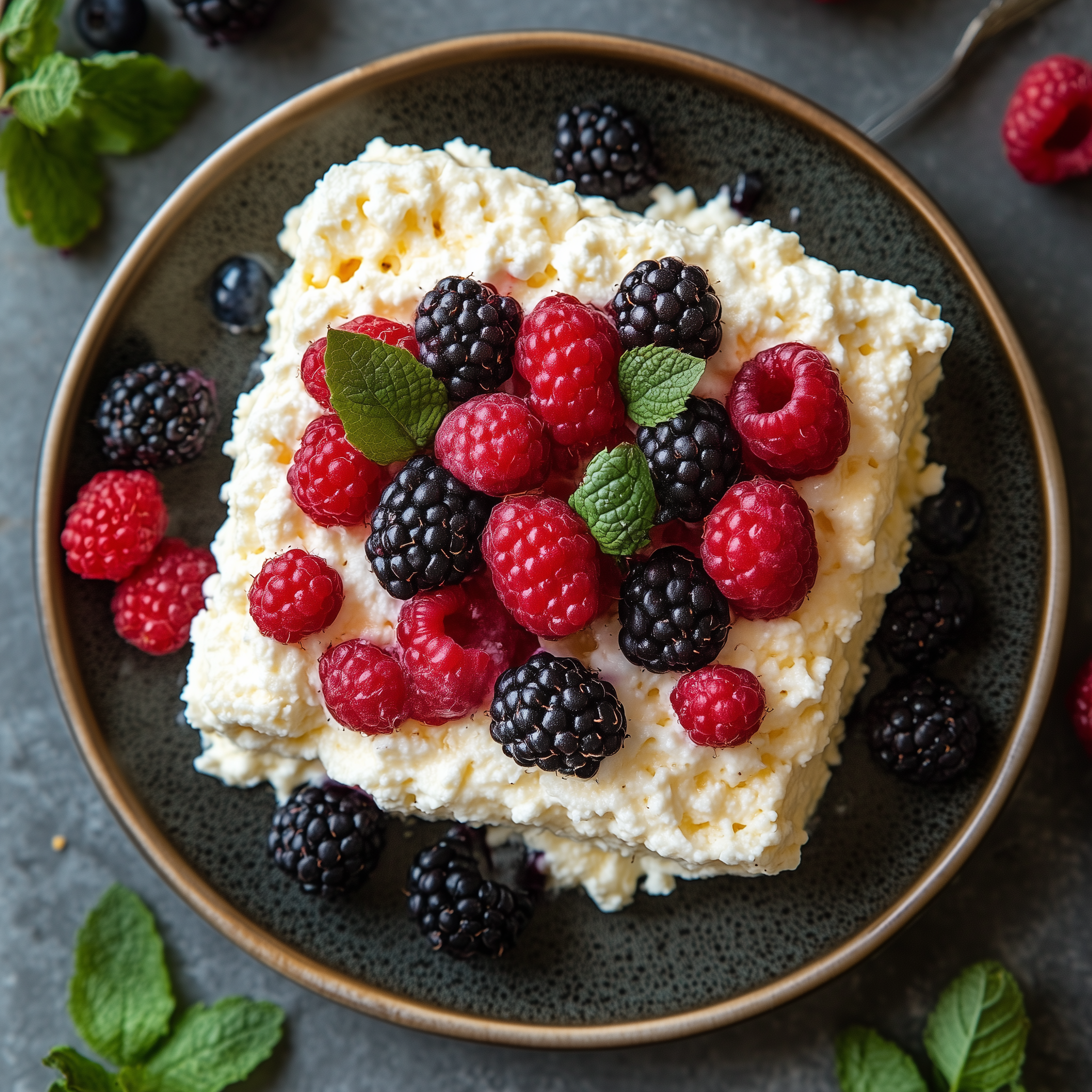 A top-down photo of a delicious cottage cheese casserole topped with fresh berries on a white plate. The vibrant colors of the berries contrast beautifully with the creamy texture of the casserole.